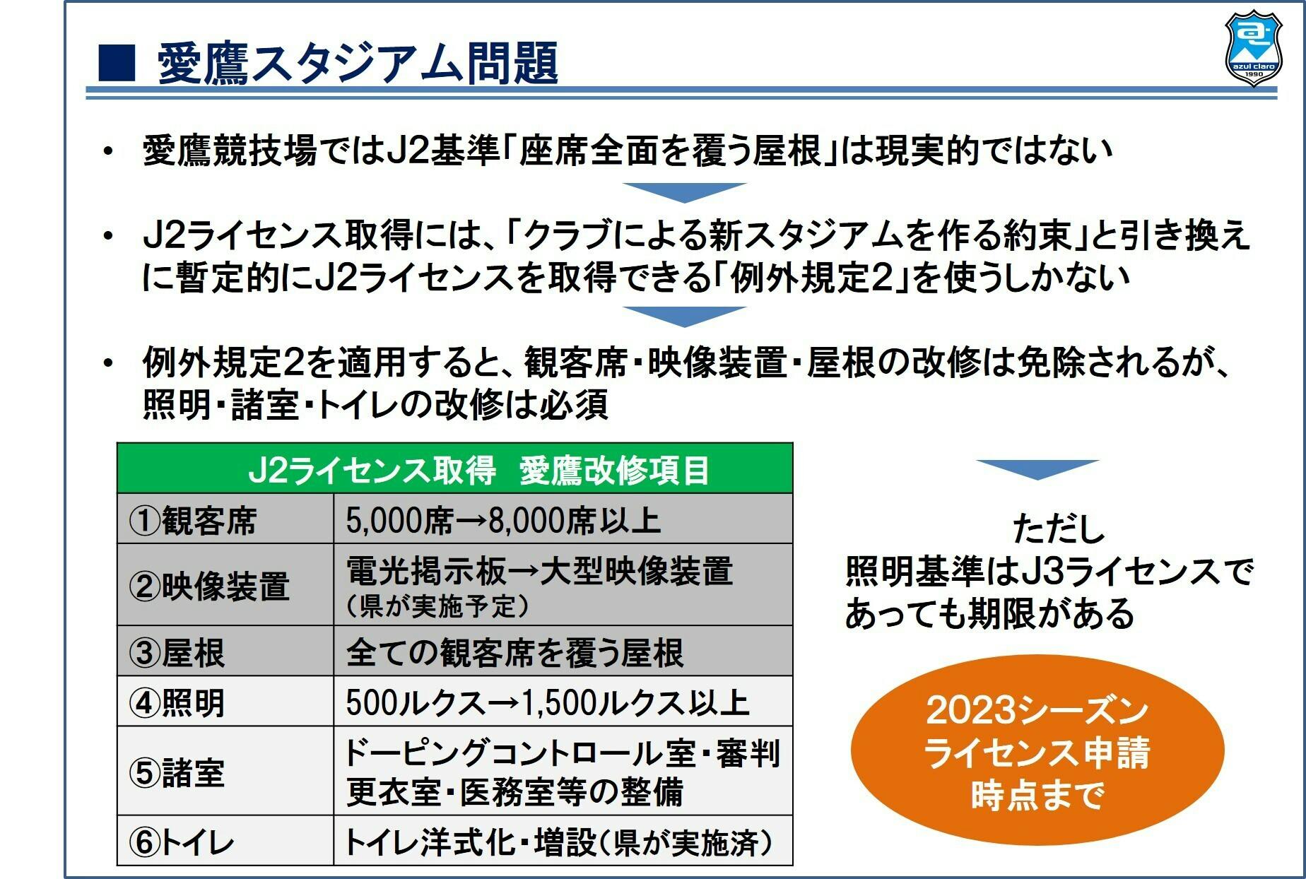しかしながら、現ホームスタジアムである静岡県営愛鷹広域公園多目的競技場(以下、愛鷹(あしたか)競技場)の夜間照明は現在500ルクスの明るさであり、Jリーグ基準1,500ルクスを満たしておらず、早期の改修が実現できなければ2023シーズン以降はJリーグライセンスが発行されない見通しです。