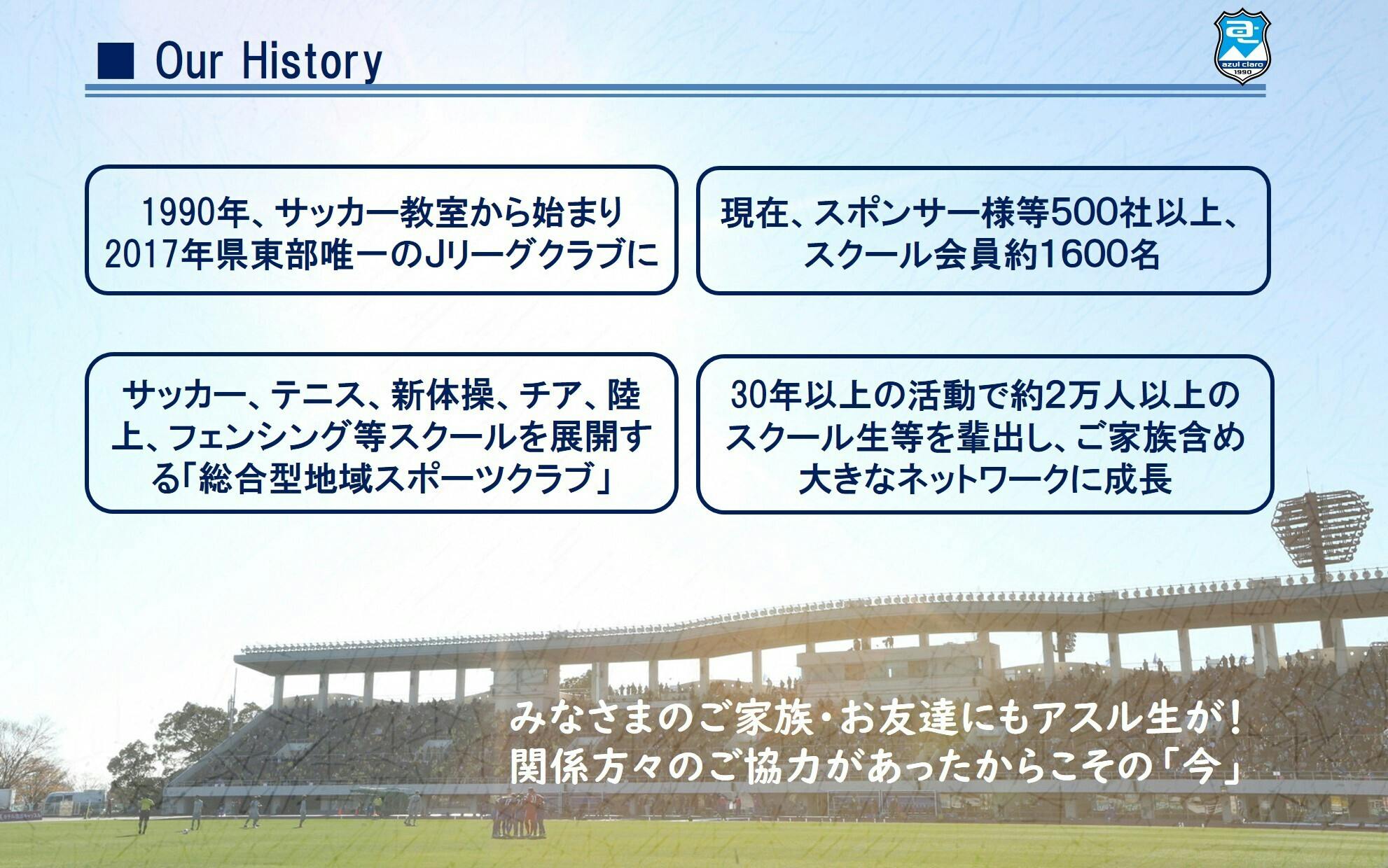 選手はいつだって「全力アスル!」のもとひたむきに戦い走ってきました。30年後に「やっぱりアスルがあってよかった」と言われる未来を確信し、クラブは新たなステージに挑戦します。