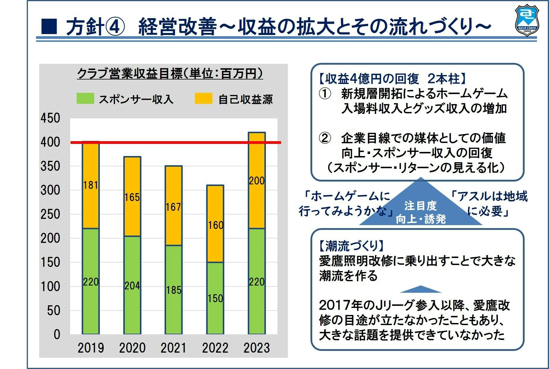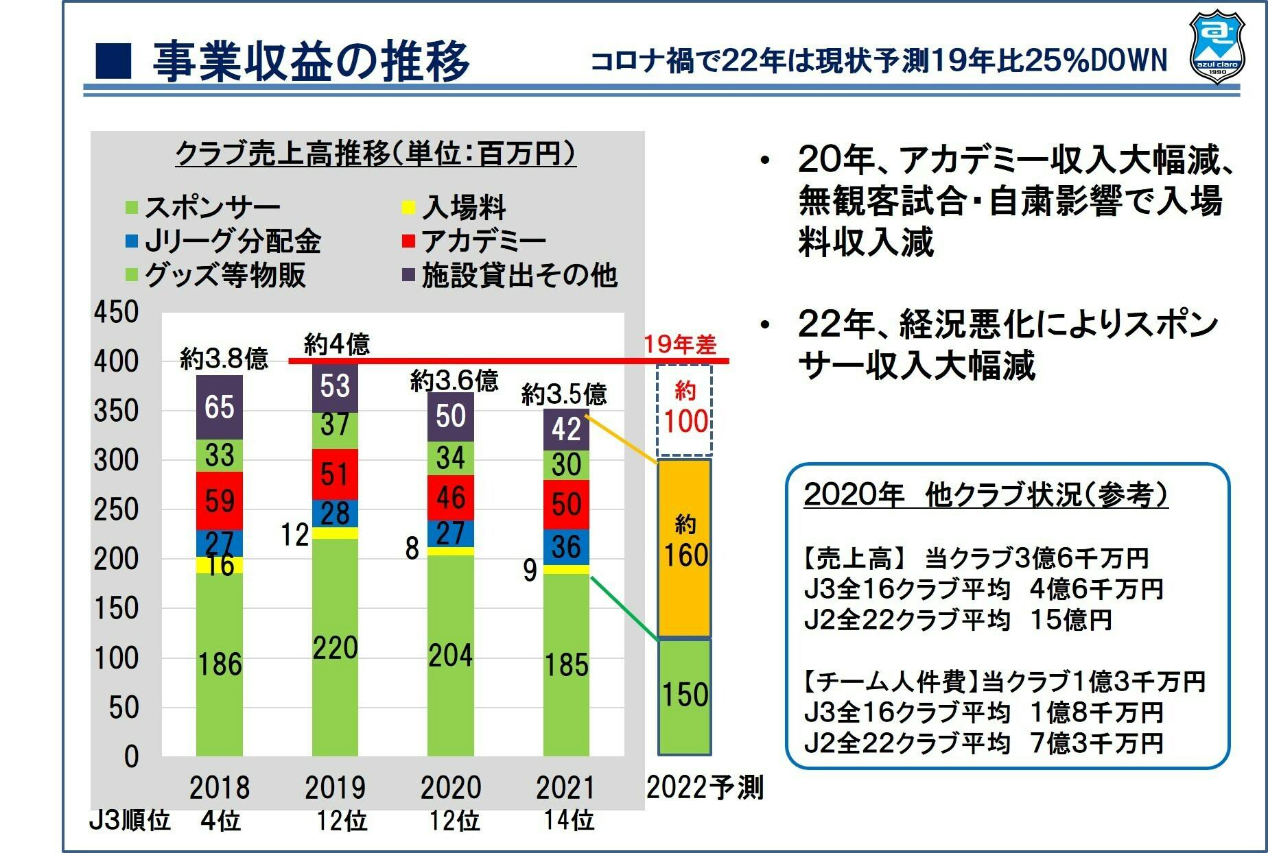 2020年度J3クラブ平均は約4.6億円となっており、4億円は最低収益ラインと考えています。これを早期に回復するため複数のアクションを実施し、上昇気流を作っていきます。