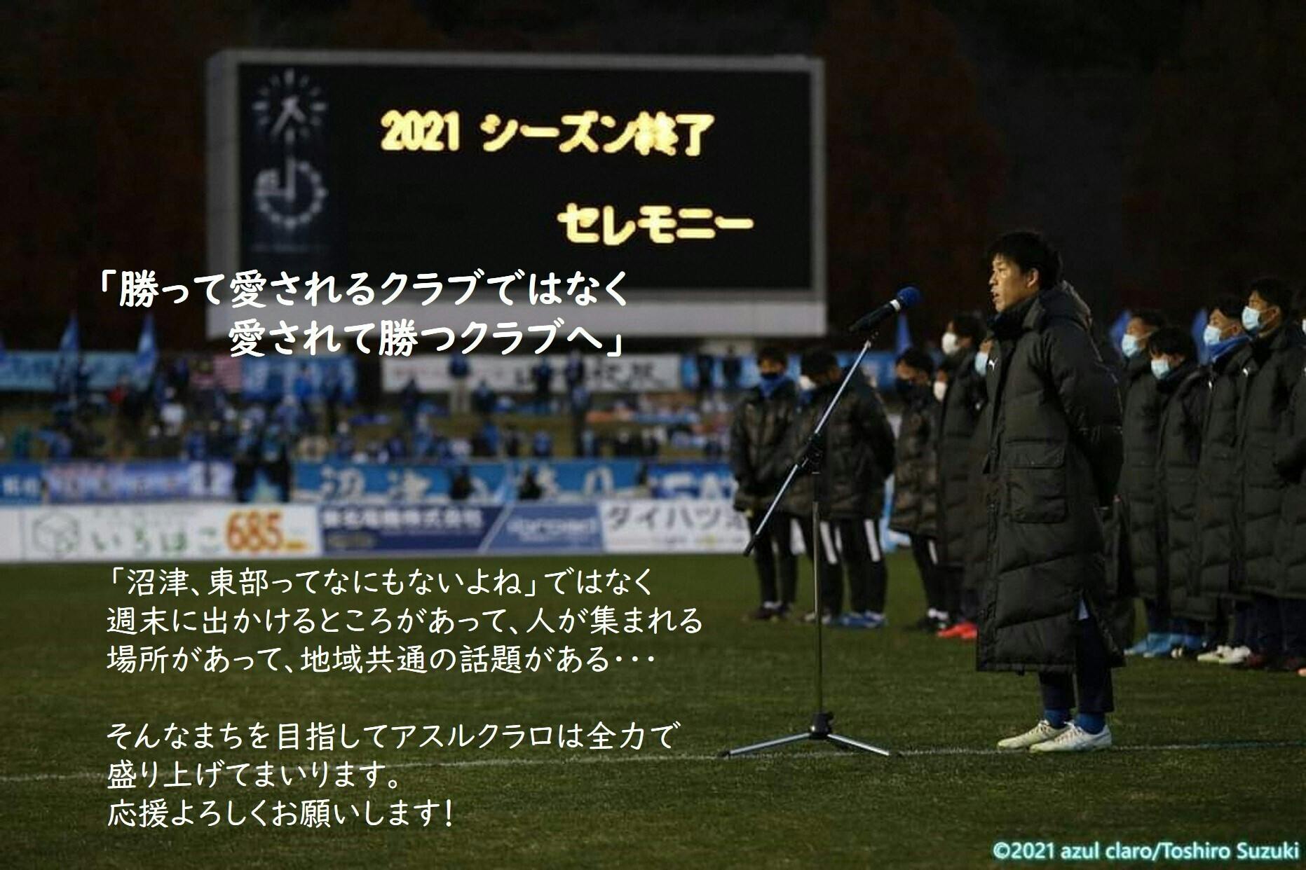 2021シーズンの最終戦となった12月5日ホームゲームは、目の前でいわてグルージャ盛岡様が昇格を決めた試合となりました。試合終了後、アスルクラロ沼津・菅井キャプテンはチームを代表し「勝って愛されるクラブではなく地域から愛されて勝つクラブを目指しています。選手はもっと地域を愛し、地域のためにやっていく、これがライセンスと昇格につながると信じてがんばっていく」と思いを言葉にしました。