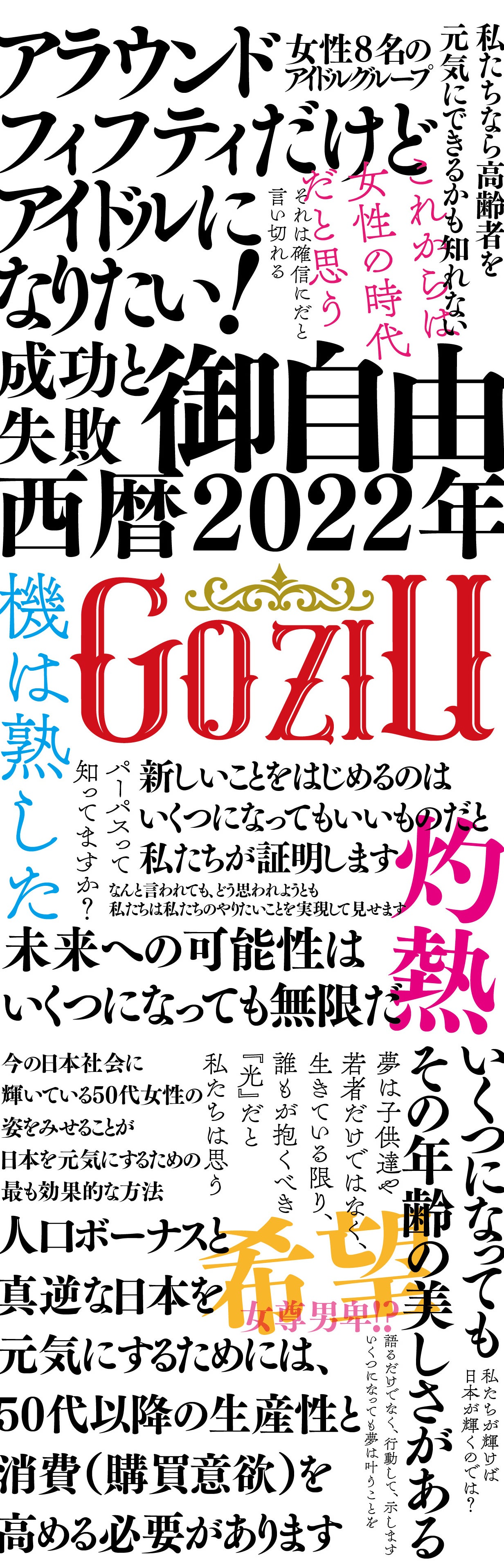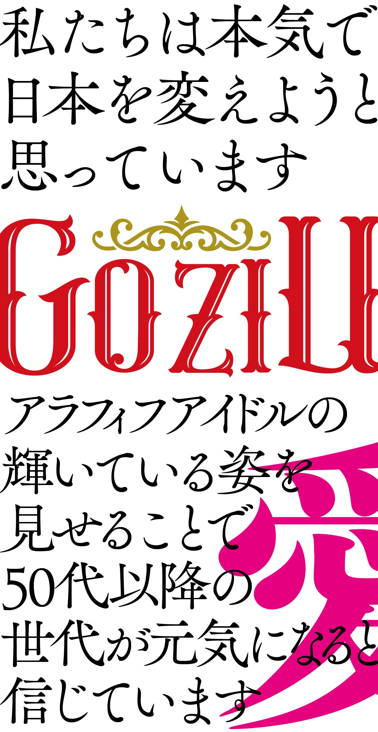 アラウンドフィフティのアイドルブループです。一般的なアイドルと違い、GoziUにはメンバーそれぞれの生きてきた様々な価値観があり、ストーリーがあります。日本を元気にするためには、現状の日本の常識を覆す必要がある、と私たちは考えています。つまり私たちは、新しい価値観を発信することで、もっと人生において、多くの選択肢があることを歌と踊りを通して伝えていきたいと思っています。