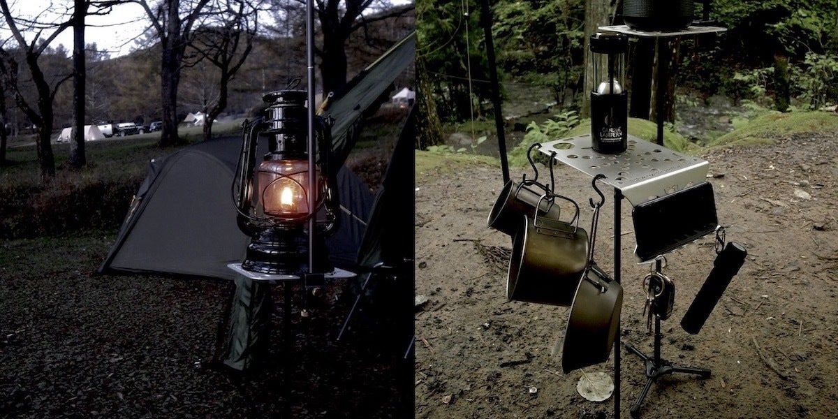 ランタンスタンドとして(左)。ユニバーサルホルダーやS字フックを使ってスマホ、クッカーやライト、鍵などをかけて使用。(右)