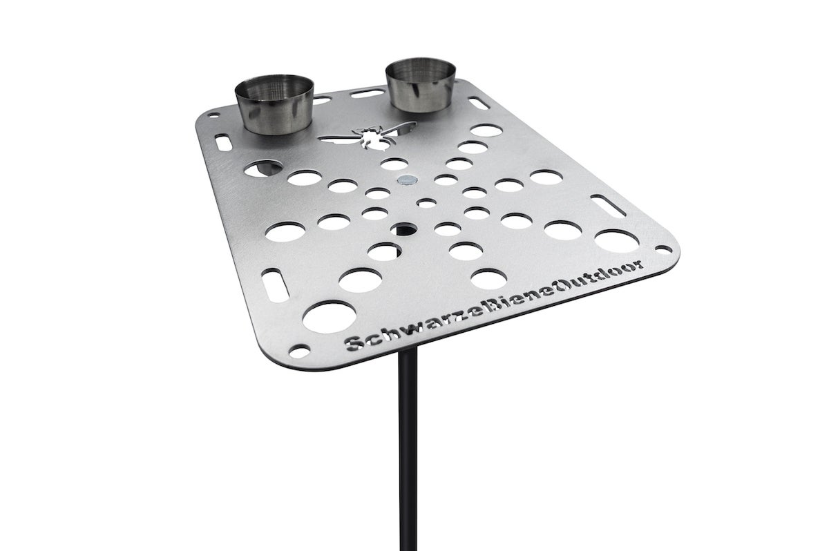 シュバルツェビーネのテーブルがあれば、お気に入りのキャンプチェアに座り、焚き火を楽しんでいる時に、近くに大きなテーブルを設置することなく、スマートに物を置けるスペースを確保できます。さらにスタイリッシュでデザイン性も高く、フィールドではレイアウトのアクセントにもなります。