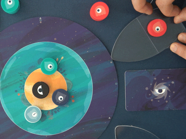 4つのコマを順番に指で弾いて、惑星にどれだけ自分のコマをおけるか競います。