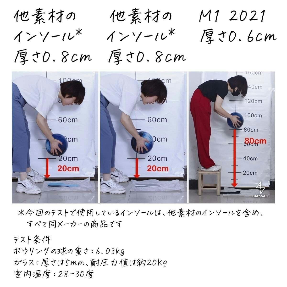 今回の新商品M1インソール2021 かかとの厚さが0.6cmは、厚さが薄くなっても、ボウリングの球を使ったテストでは、第一弾インソール(かかとの厚さが1cm)の約1.5倍の衝撃吸収力。衝撃吸収インソールとして、自信をもって販売できる衝撃吸収力になりました。