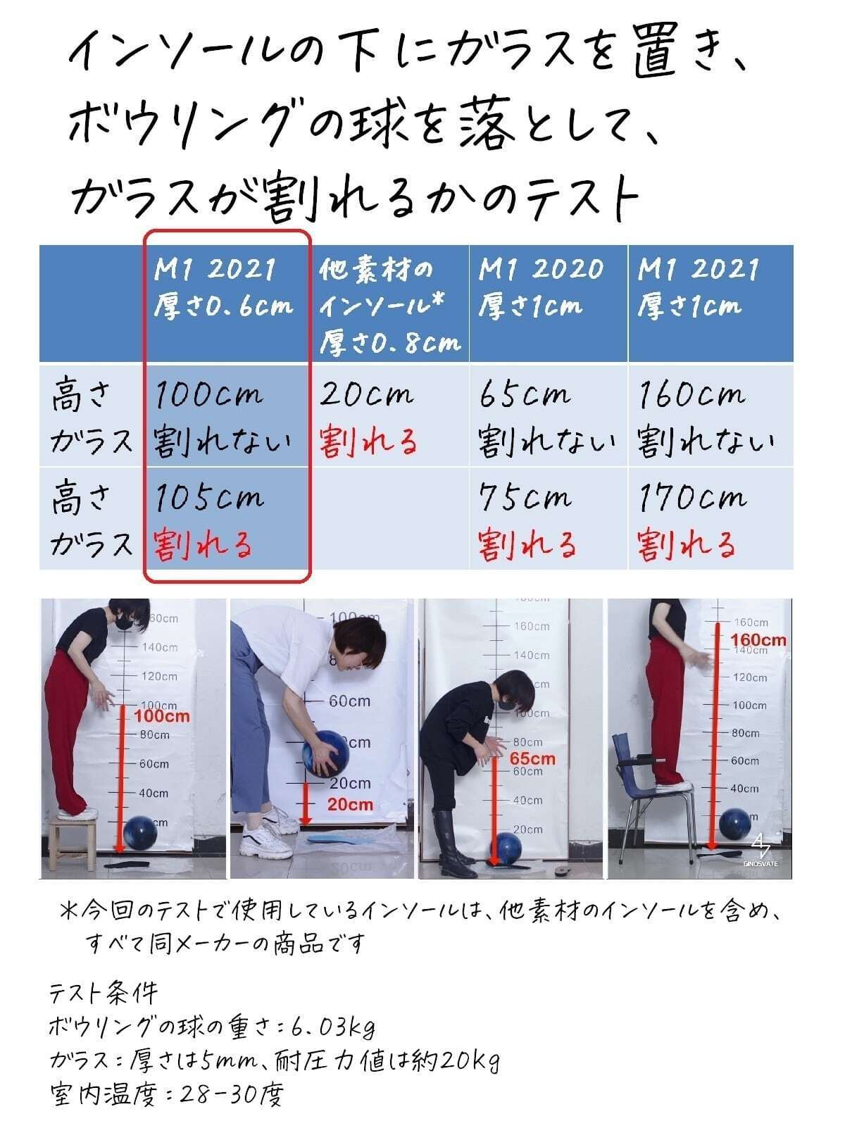 そして、今回の新商品M1インソール2021 かかとの厚さが0.6cmは、上記の新素材を使い、M1インソールとしては、初めて、かかとの厚さが0.6cmと薄い商品です。薄くなっても、第一弾インソールと比べ約1.5倍の衝撃吸収力があります。