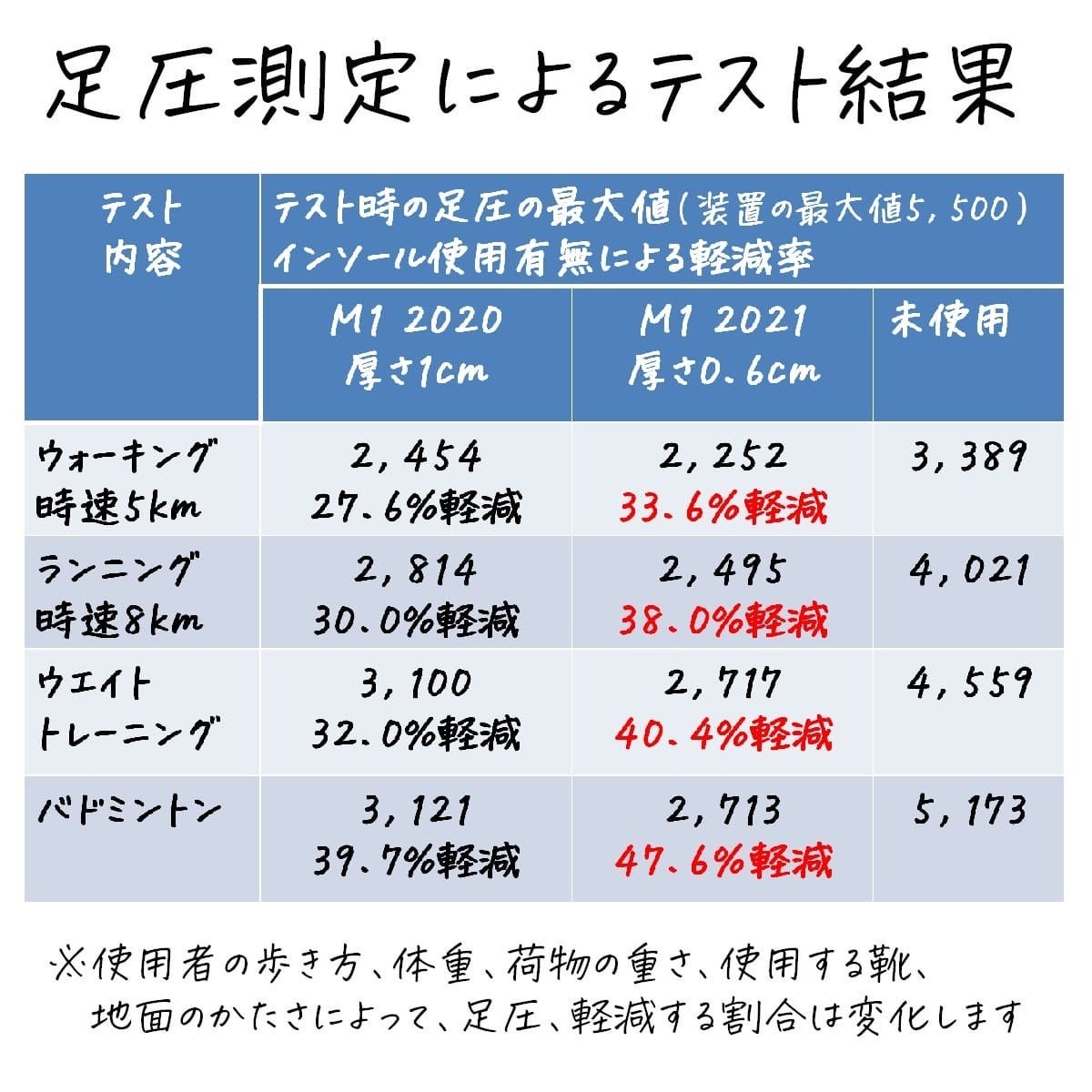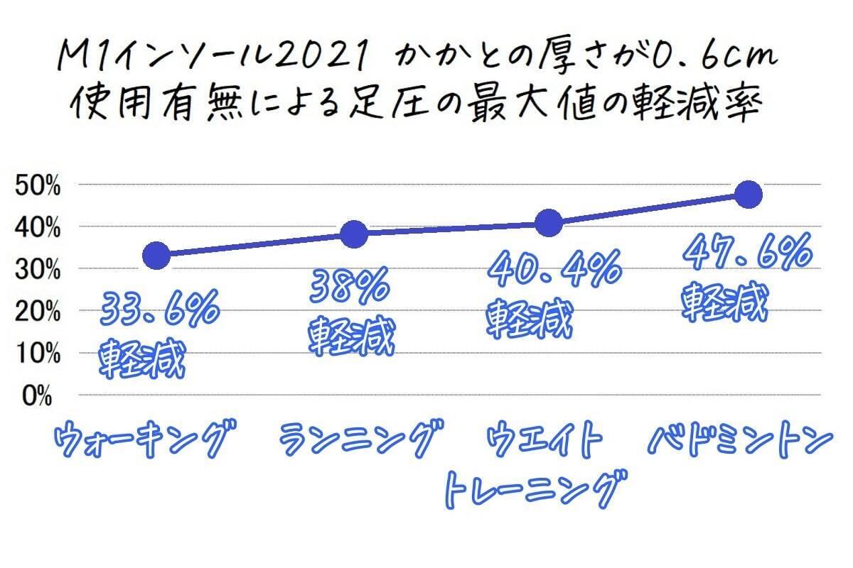M1インソール2021 かかとの厚さが0.6cmを使用することで、使用しないときと比べ、足圧の最大値が約33.6~47.6%軽減というテスト結果を得ました。