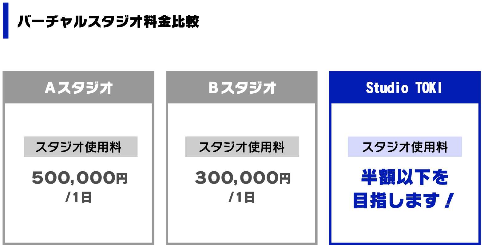私たちが手がける「StudioToki」ではその課題を解消し、品質の高い機材をそろえたレンタルスタジオとして、お値打ちな価格でクリエイターの皆さんに利用してもらうことを目指します。そして、さまざまな“あたらしい表現を実現できる場所”としての意味を築きます。