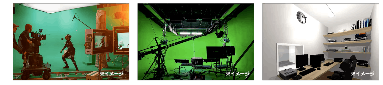 CGキャラクターにアニメーションをつけたり、Vtuberの動きを滑らかに表現したり、スポーツ選手の動きを分析できる最新鋭のモーションキャプチャーシステム、そのほか撮影に必要な機材やクロマキーも完備し、撮影・表現の幅をグッと広げられるような環境を整えます。