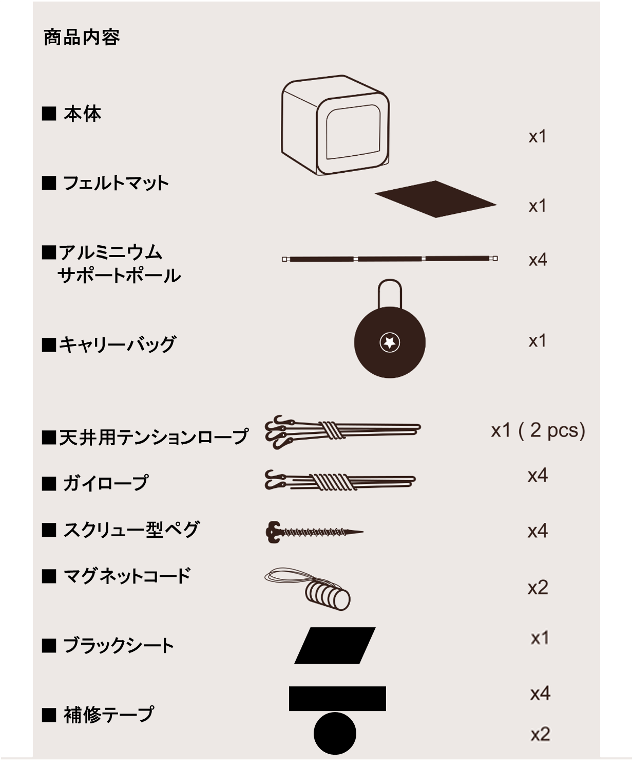 A:生地の破れについては、付属の補修テープが便利です。また、ポールや接合部分のパーツ等の交換可能なパーツの破損については公式サイトにてご購入頂けます。