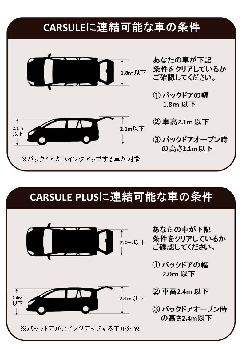 通常サイズのCARSULEに加え、高さが2.4mまで設置可能なCARSULE PLUSが新登場。幅広い車種に設置することができます。