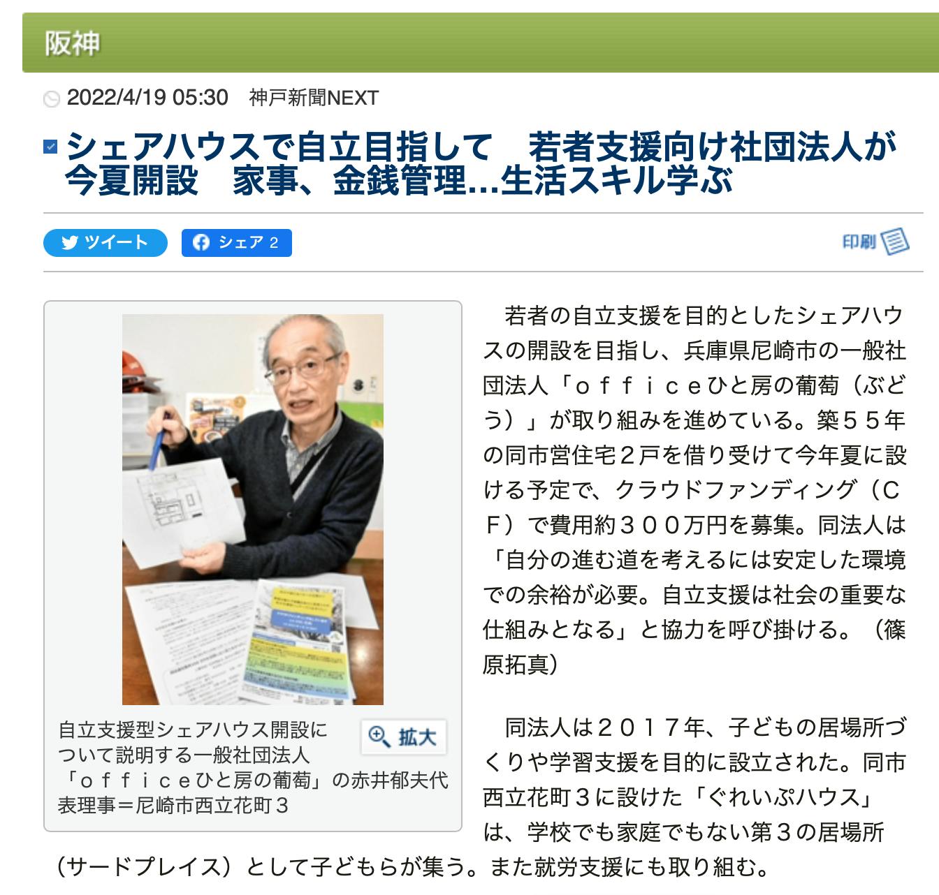 尼崎経済新聞記事(2021.11.15):尼崎の若者支援団体が「自立支援型シェアハウス」来年夏開設へ向け取り組み進む