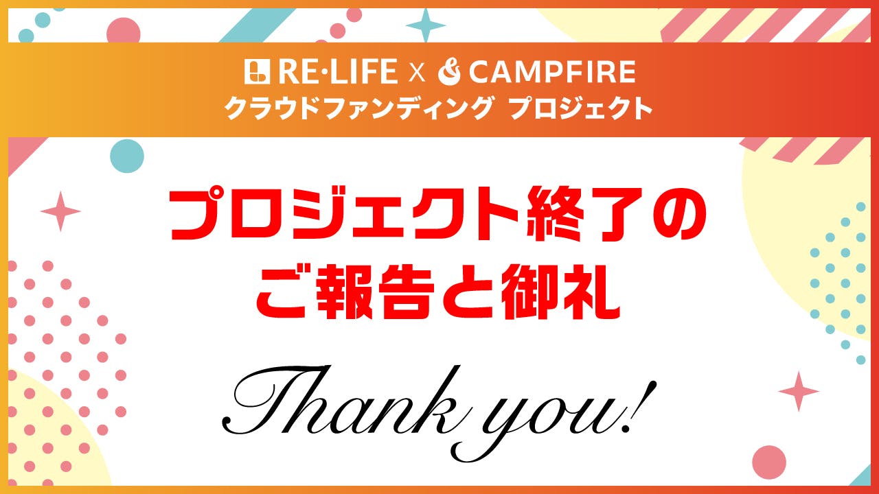 2023/03/20 18:303月19日をもちまして、株式会社リ・ライフのCAMPFIREプロジェクトのご支援募集期間が終了いたしました。この度は、私たちのプロジェクトにご支援を賜り誠にありがとうございました。多数の温かいご支援をいただき、最終日には目標金額の435%を突破しました。64名の方からの支援、合計1,307,568円というご支援をいただきましたこと感謝申し上げます。予想をはるかに超えるたくさんの方からのご支援をいただき、とても嬉しく、心強く感じています。本当にありがとうございました。ひとつひとつのメッセージにも大きな力をいただきました。ご支援いただいた皆様、ご共感いただき応援していただいた皆様、クラウドファンディングのサイトを閲覧してくださった皆様、本当にありがとうございました。また、ご支援いただいた皆様のリターン品の準備を進めてまいります。3月下旬〜5月初旬を目処にお届けやご連絡いたしますので、もう少々お待ちください。これからは皆様からのご支援とご期待に必ずや添うべく、スタッフ一同更に気を引き締め、今まで以上に皆様から愛していただける店舗を目指して邁進してまいる所存です。引き続きご愛顧賜ります様何卒宜しくお願い申し上げます。2023年3月20日株式会社リ・ライフ代表取締役 稲見 育大スタッフ 一同 もっと見る