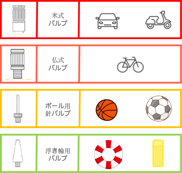 ※ホース備え付けの米式バルブ以外に、仏式バルブ、ボール用針バルブ、浮き輪用バルブの計3種類のバルブが付属しています。