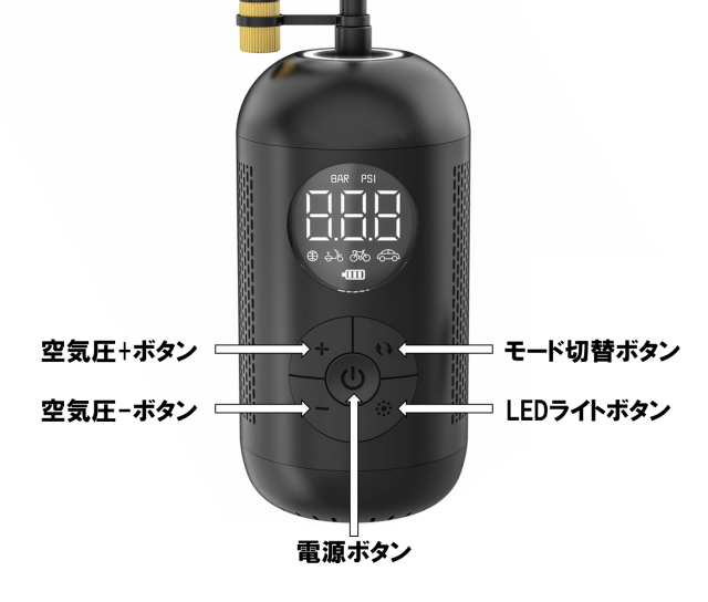 ※目標空気圧に到達すると自動的に充填を停止しますが、途中で任意で停止したい場合は再度電源ボタンを短く押してください。