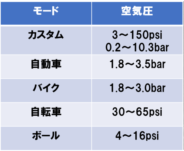 空気充填モードは、自動車、バイク、自転車、ボール、カスタムの5種あり、対象に合わせ適切な目標空気圧を設定可能です。