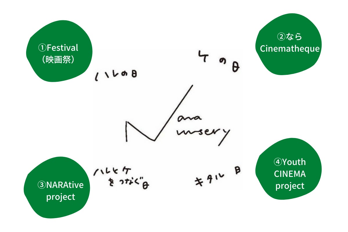 1つ⽬は、ハレの⽇の「本祭」、2つ⽬はケの⽇の「ならシネマテーク」、3つ⽬はハレとケをつなぐ「ナラティブプロジェクト」、4つ⽬はキタル⽇の「ユースシネマプロジェクト」。お庭にはそれぞれの想いがあり、そして世界への扉があります。