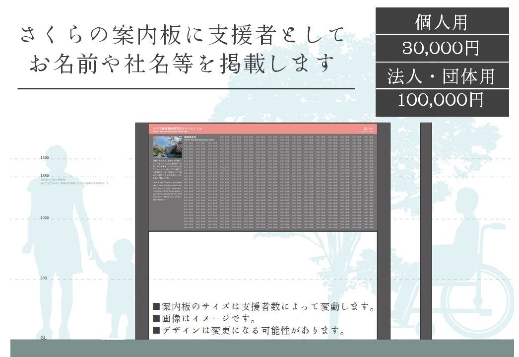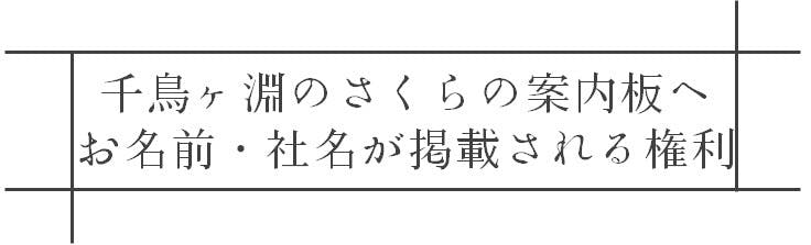 千鳥ヶ淵に設置予定のさくらの案内板に支援者としてお名前を掲載します。個人の方はお名前(ニックネームなども可)、法人の方は社名、または団体名が記載されます。千代田区のさくらにご支援いただいた証として、 日本有数の桜の名所でさくらまつり時は100万人もの方が訪れる千鳥ヶ淵に名前を残しませんか?