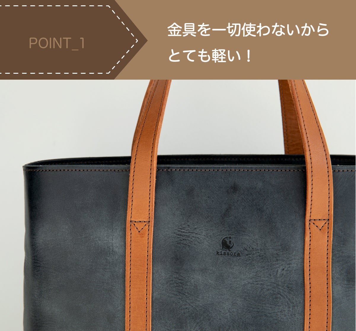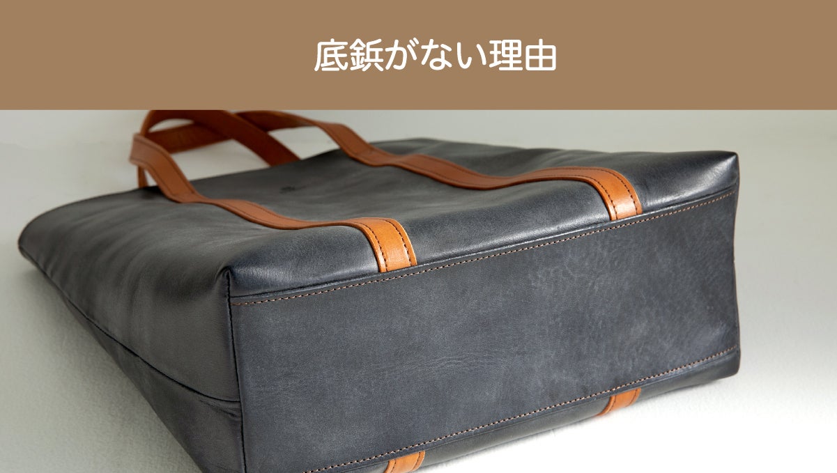 バッグが汚れないよう底部分に付属している底鋲。しかし、永く使うにつれて底鋲部分がバッグの革に食い込み、凹んでしまうことがあります。そのようなリスクを回避するため底鋲はあえて付けないことにしました。底鋲が無い分、軽量化にも繋がりとても軽いレザートートができました。
