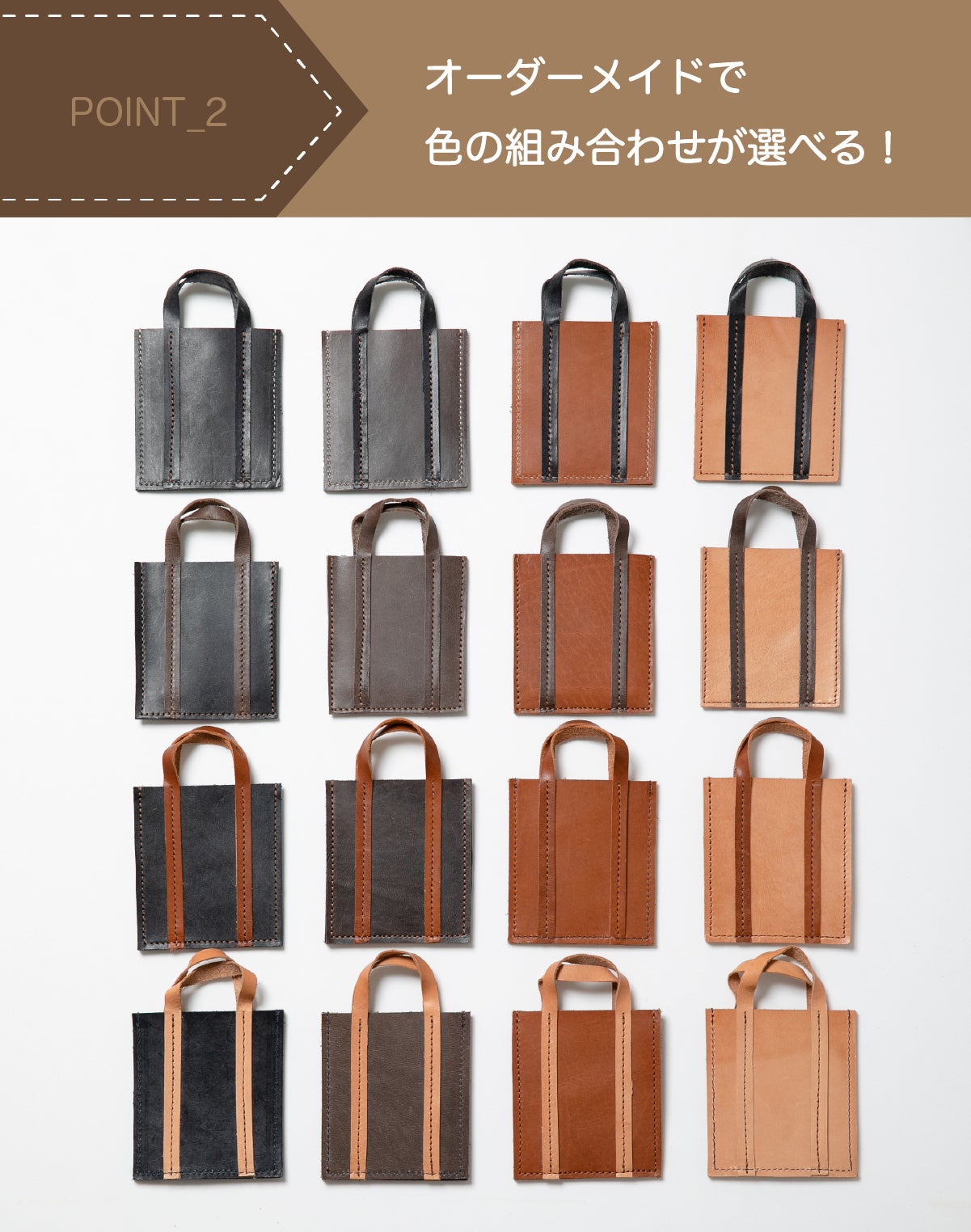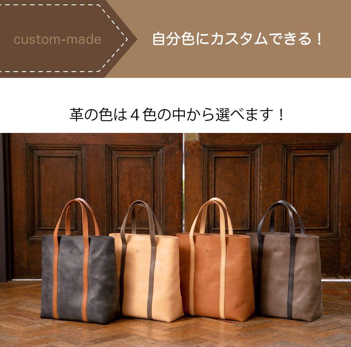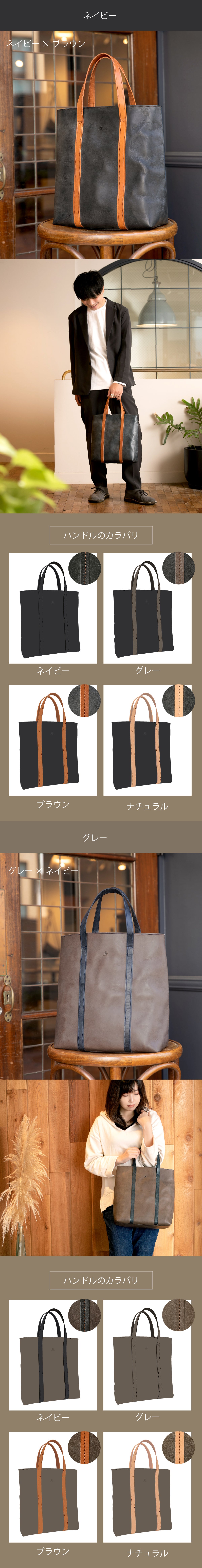 トートバッグ本体の色とハンドルの色、さらに縫い糸の色がお好みで選べます。全てのパーツカラーは「ネイビー・グレー・ブラウン・ナチュラル」の4色!経年変化も楽しめる、あなただけのオーダーメイドバッグとして永く愛用いただけます。