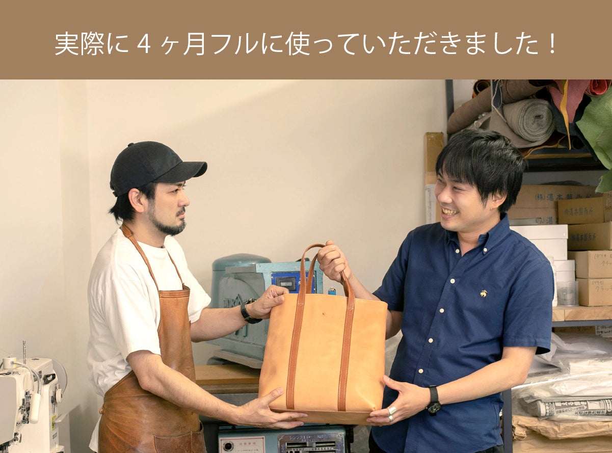 仲良しの大友店長にバッグをプレゼントして、革がどのように変化するのか実際に体験していただきました!この革は雨の日も風の日もガシガシ使った方が良い味が出るとのこと。4ヶ月後にはどのような色になっているのでしょうか。