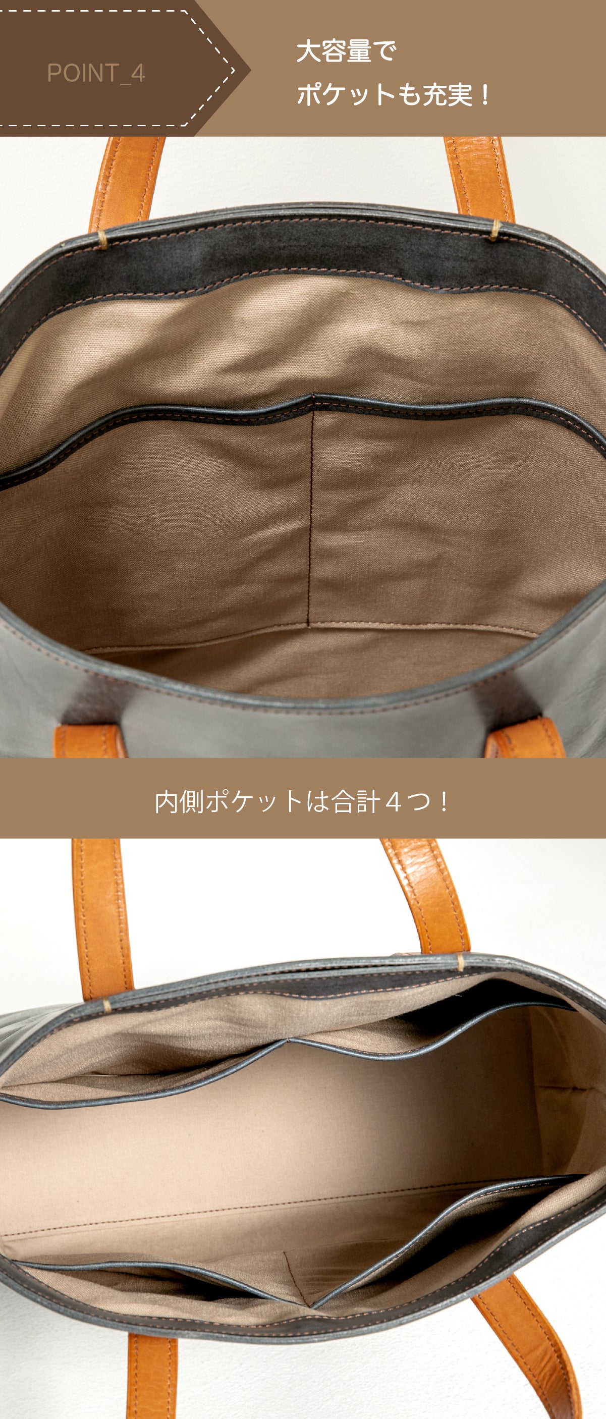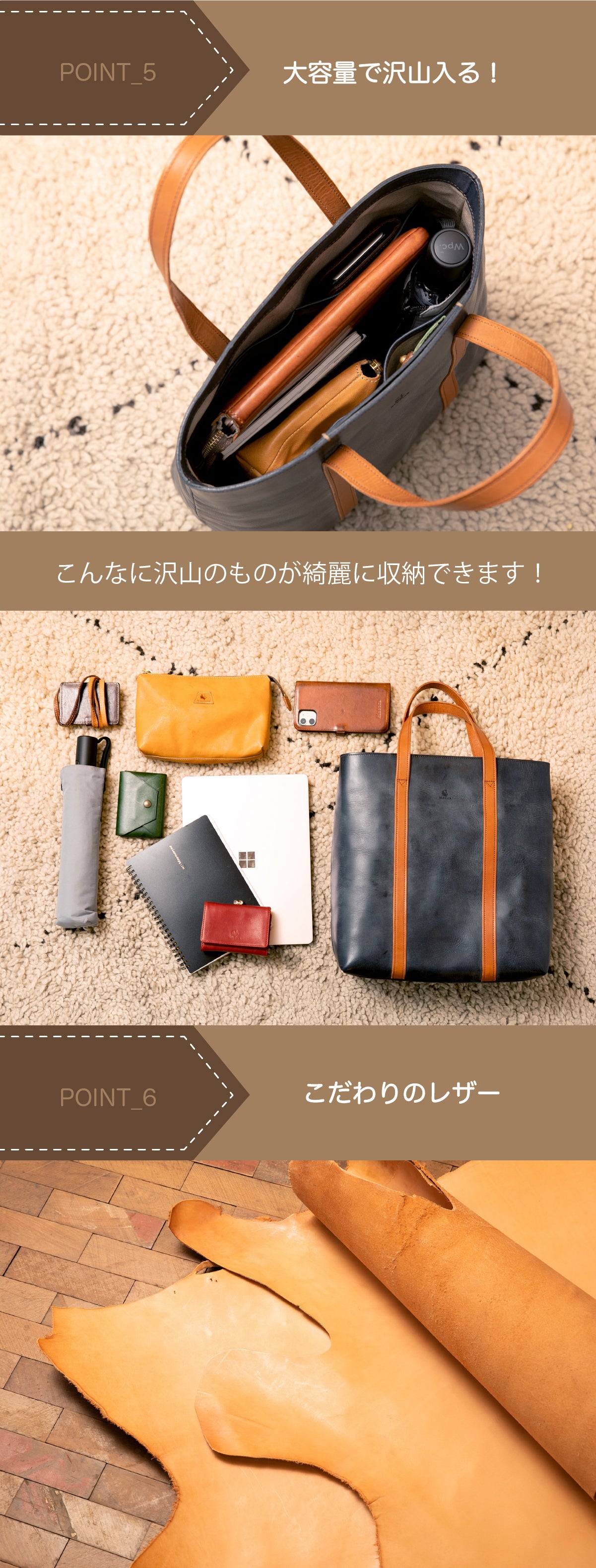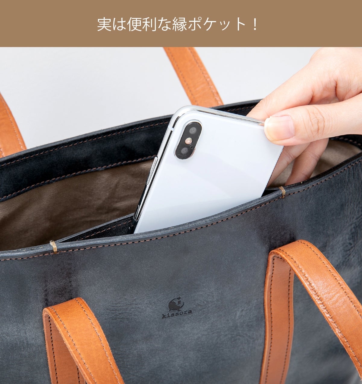 ハンドル部分の革もネイビー、グレー、ブラウン、ナチュラルの4色からお選びいただけます。
