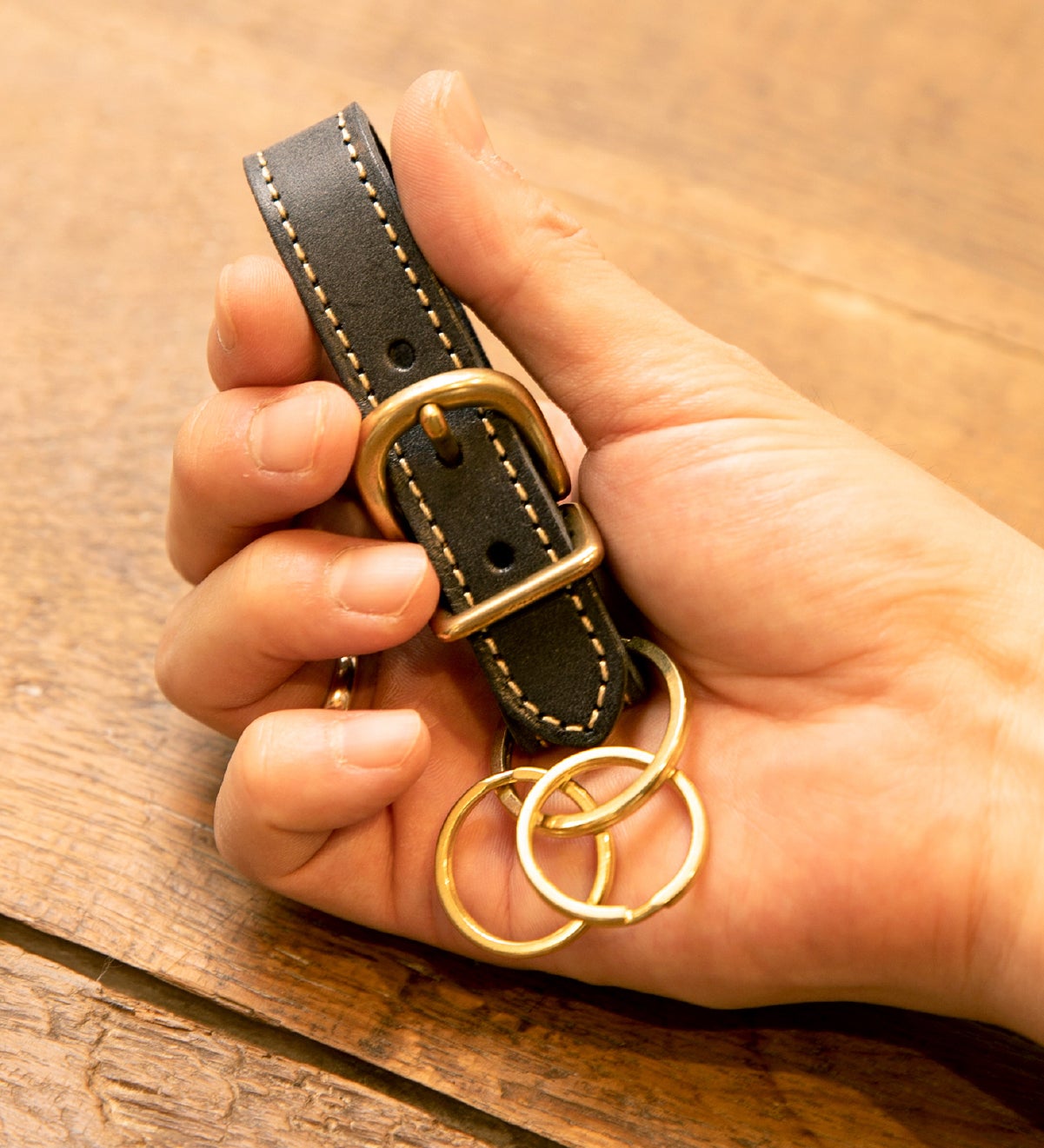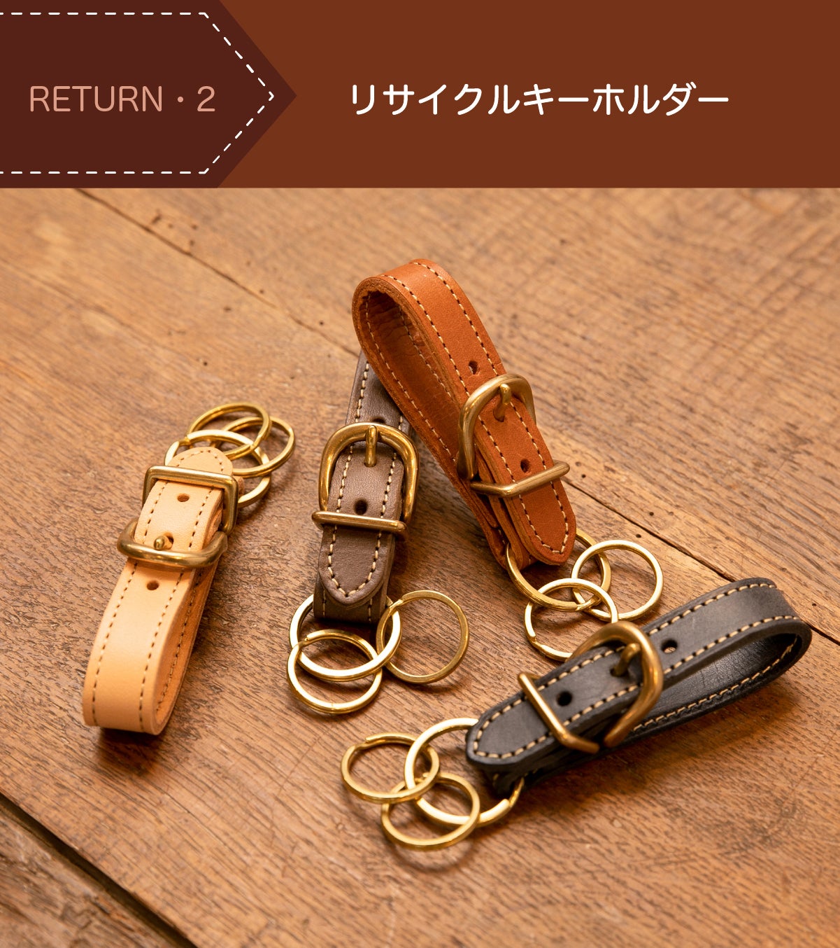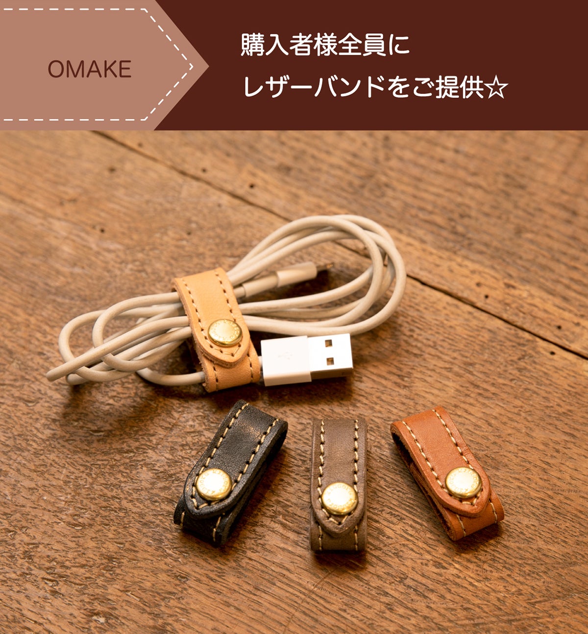 レザーバンドはコードなどをまとめる時に使うグッズ。今回キーホルダーかトートバッグをご購入いただいた方全員に無料で提供させていただきます!細部の小物にレザーを使うと、大人っぽさがぐっと増して素敵。こちらもトートバッグの端切れで作っており、使い捨てではない感じが良いですね。