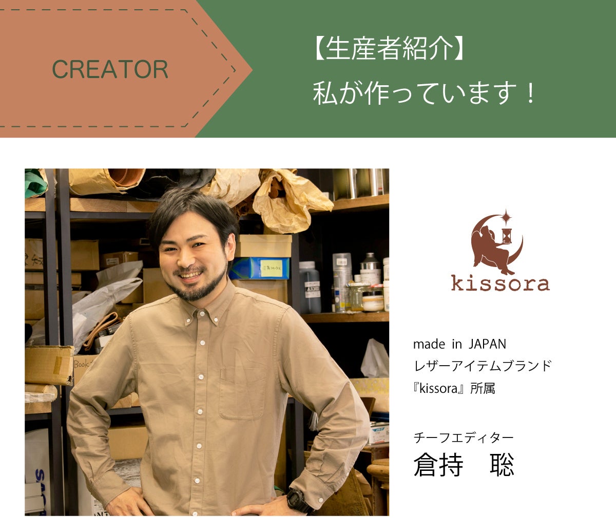 倉持聡が出演しているYouTubeチャンネル「kissoraの中の人」彼のキャラクターがよく分かる楽しい配信となっております!革に関するクイズやkissoraの裏話も満載です☆ぜひご覧ください!