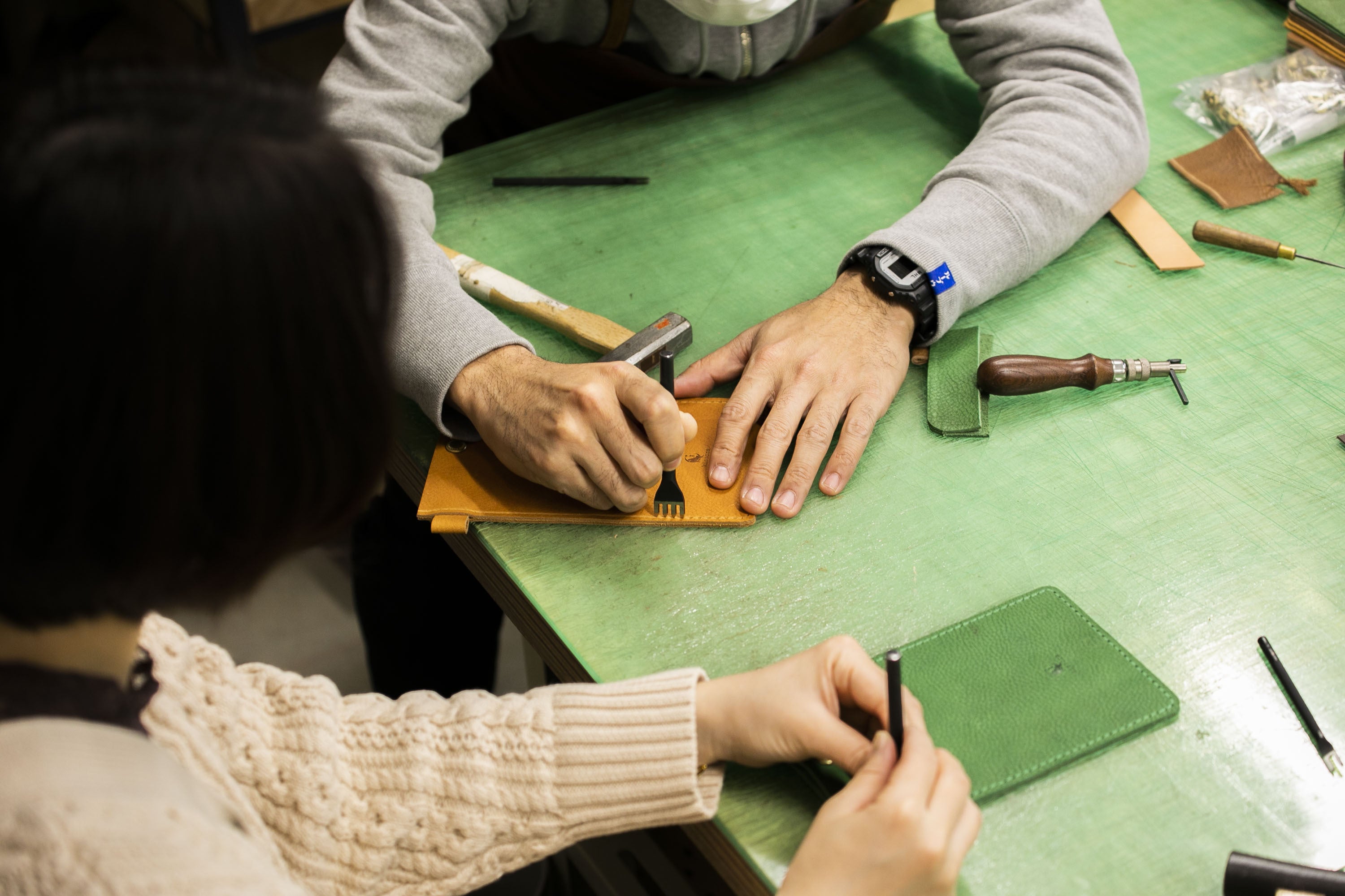 2022/12/27 18:52本日はクラウドファンディングのリターンとしてスマホポシェットワークショップ第2回目を開催いたしました。前回同様、革のパターンを選ぶことからスタートし、道具の説明を踏まえながら工程ごとにものの仕組みを伝えながらワークショップが進行していきました。ご参加いただいたのは学生時代からkissoraに触れてきたという方で、クラウドファンディング、ワークショップ参加共に初めての体験とのことでした。こういった機会でなければレザークラフトにチャレンジすることもなかっただろうと仰りながら、職人・倉持レクチャーのもとレザークラフトのいろはに触れていただきました。ものづくりでしか味わえない指先を使っていく感覚や処理される前の革の状態などもご覧いただけたことで、ものの成り立ちにも触れていただけたのではないかと思います。糸を通すための穴の開け方やそこに針を通すだけのように思えたものでもさまざまな工夫の上に成り立ち、わたしたちが普段目にしている製品のような仕上がりになることも肌をもって感じていただけました。現在、倉持は本格的にオーダーいただいた商品の製作にも取り掛かっており、ワークショップの合間にはリターンの一つ、キーホルダーの途中経過をご覧いただく場面もありました。この日のためにYouTubeなどもご覧いただいていたとの嬉しい言葉もいただきながら実際手を動かしてみると力加減など難しいですね、との体験してみた感想に加え、普段から革物に触れるのが好きではあるものの既製品を持つだけだったので、自分で作ることができてさらにそれを使えるのが嬉しいですと言葉も残してくださいました。全2回の開催となったワークショップも無事に終了。次はオーダーいただいた皆様の元へお届けするべく製作の日々を残すのみとなりました。実際このようにワークショップを開催して生の声を聞いてみると我々の活動がお店や画面を通して皆様と共有できていることを実感します。クラウドファンディングは夏頃より駆け抜けた半年でしたが、完了するまで全力で気合を入れて参りますので、引き続き活動の様子など見守りいただけますと幸いです。2022年の活動報告は本日がラストとなります。お世話になった皆様、誠にありがとうございました。どうぞ良いお年をお迎えください。次回はバッグの製作風景をお届けする予定なのでぜひお楽しみに。今後ともどうぞよろしくお願いいたします。 もっと見る
