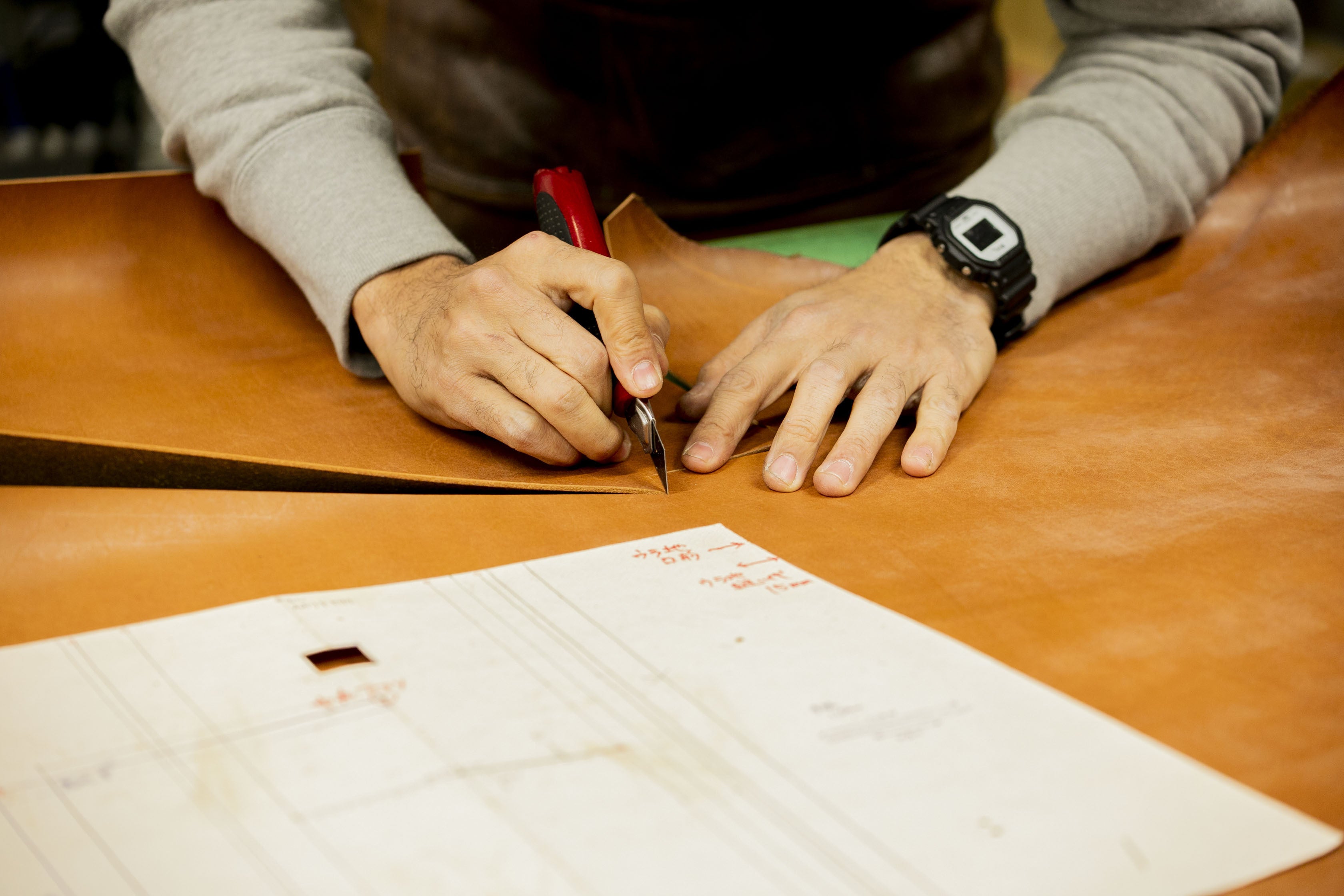 2023/01/13 18:41皆さま、明けましておめでとうございます。本年もどうぞよろしくお願い申し上げます。今回の活動報告では本格的に進行し始めたオーダーバッグの製作風景を公開いたします。ぜひご一読ください。本プロジェクト製作担当の職人 倉持は、年末年始にかけてオーダーバッグの本格的な作業に取りかかり始めました。今回のクラウドファンディングでオーダーいただいたのは11点のバッグ。いずれも同じ組み合わせは一つとしてなく、全てがオンリーワンのアイテムとなっております。オーダーいただいた数に合わせて新たに革を仕入れることからスタートし、まずはパーツごとに裁断を行っていきました。始めに切り出したのは手紐のパーツ。約110cmほどの長さをまっすぐ同じ幅で手作業で切り出す工程を前に「これが一番苦手なんだよね」と一言。「全集中!」と言葉を続けて黙々と切り出しが始まりました。弱音を出しつつも学生時代を含めると15年以上のキャリアを持つ倉持は慣れた手つきでスムーズに作業を進めていきます。手紐が重なる部分は「粗裁ち(大まかに切り出すこと)」を終え貼り合わせ作業の後「本裁ち(実寸に合わせて正確に切り出すこと)」を行い、縫い合わせていきます。今回のオーダーでは本体、手紐のお色味に加えて糸の色も選択可能なため組み合わせは64通りあります。オーダーいただいたパターンを間違えることのないようにダブルチェックを重ねながら慎重に革と糸が組まれていきました。ミシンがかけられ集まった22本の手紐を前に次の工程を待っていると、倉持が手にしたのは再び手紐。縫い合わせた後にコバ(木端、裁断面の意)を処理すると言います。裁断時に角が立った部分削ぎ落とし、TOKO艶クリームで断面を処理していきます。広い工房の中で手先を細やかに動かす動作を前に「地味な作業でしょう」と一言。革の質感を魅せる画やミシンのテクニカル的な技が光る場面ではないから…との配慮の言葉でしたが、その華やかな一面以上に鞄を持ち運ぶ上で最も手が触れる部分だからこそ、このようなひと手間が使う人に寄り添うのであろうという作り手の想いを感じることができました。手紐の作業を終えると続いては本体の革の切り出しへと進行していきました。職人 倉持が運営するYouTubeチャンネル「kissoraの中の人」ではオーダーバッグの構成や製作工程をさらに詳細にご覧いただける動画も公開しておりますので、気になる方はぜひそちらもチェックしてみてください。私たちが普段使用するアイテムにはどれもその裏側には製作者がいます。その作り手や工程。こだわりを知ることでさらにアイテムに対しての親近感や愛着を持ってもらえると嬉しいです。そして作り手もまた、生産時にはそれらをいつか使う方達のことを浮かべながら作業をしています。活動報告ではものづくりの裏舞台で勤しむ職人の姿をよりリアルにお届けできればと思っておりますので、こんなところを見てみたいなどございましたら、SNSやYouTubeなどでコメントお願いいたします。次回はオーダーいただいた皆様へお届け直前の様子とともに製作の進捗を活動報告として投稿いたします。早いもので1月も半ば。ご支援いただいた皆様へ1日でも早くお届けするべく製作を進めておりますので、今しばらくお待ちいただけますと幸いです。 もっと見る