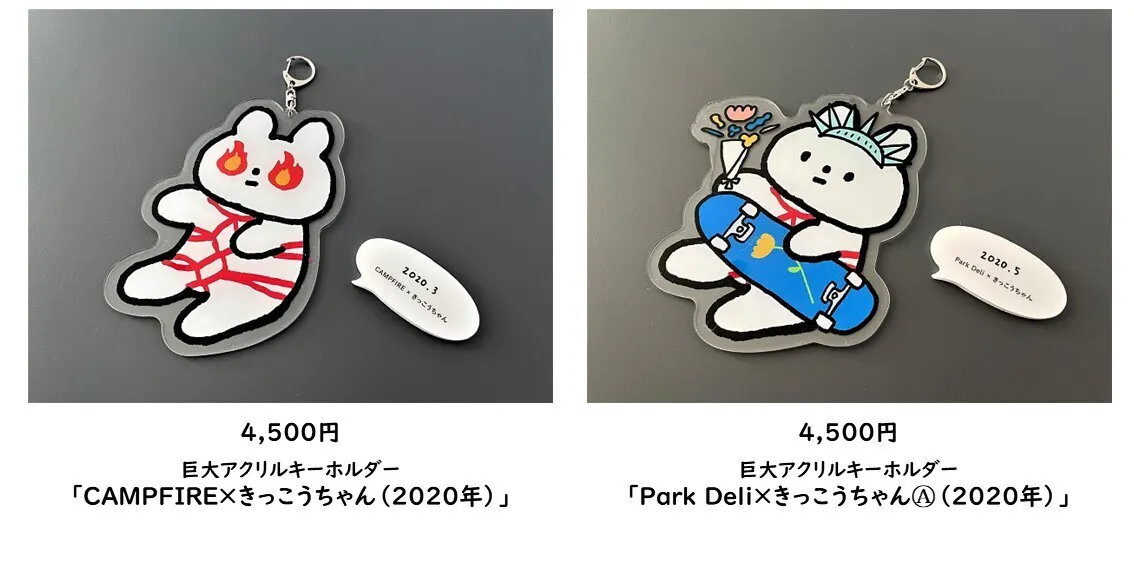 このプロジェクトページでは、2019年~2020年に発表されたきっこうちゃんの巨大アクリルキーホルダーを販売致します。すべて展覧会用に制作され、展示された1点ものです!
