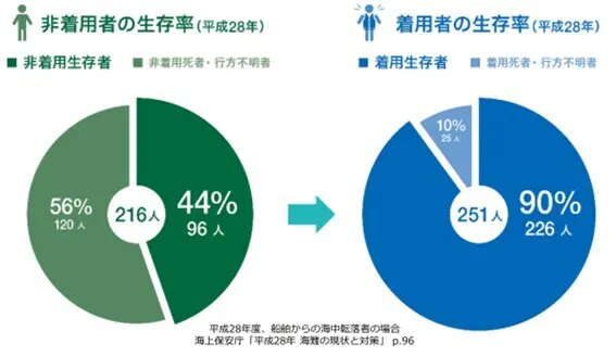 一方で、ライフジャケットを着用することで、事故が起きたとしても生存率は倍以上に高まることが報告されてます。