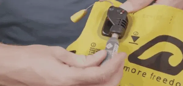 トリガーを引くと付替え式のカートリッジから炭酸ガスが供給され、バルーンが数秒で展開します。