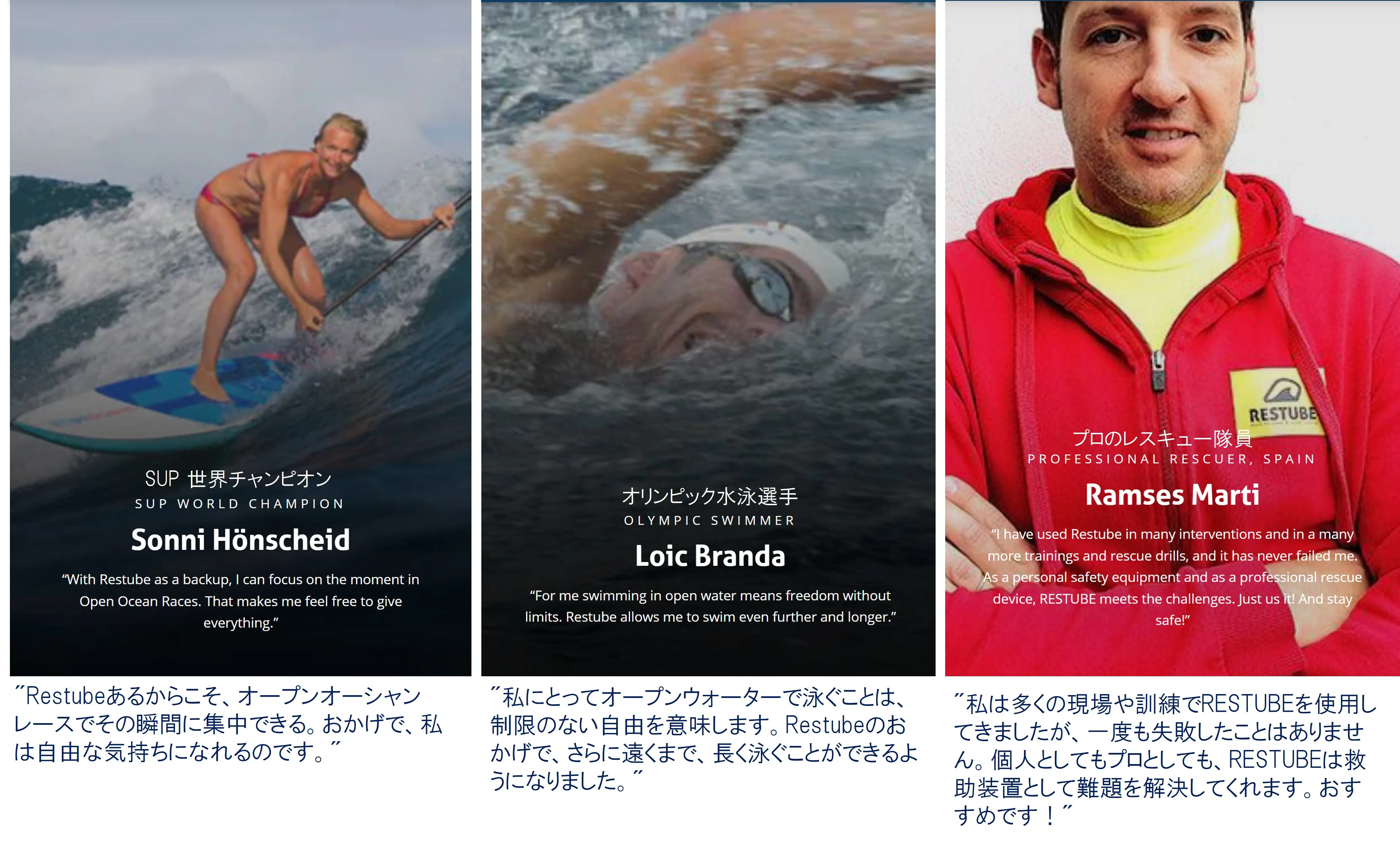 RESTUBEはサーフィン、SUP、ライフガードなど海上の様々なシーンで利用されてます。まずは海のプロによる生の声を紹介します。次に、一般利用者のレビューをご紹介します。