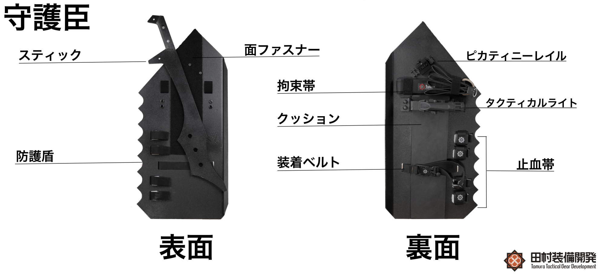 ・「盾」「スティック」の形状が変更されることはありませんが、特別セットのオプションである拘束具については皆様にお届けするギリギリまで開発を行いますので形状が変更される可能性がございます。また、タクティカルライトにつきましても更に高性能な物に変更される予定です。今回紹介させて頂きましたタクティカルライトと拘束具につきましては、装着例としてご理解頂けましたら幸いです。