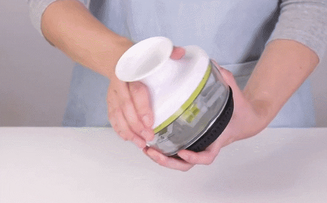 容器に入るようにザク切りにした野菜や果物を入れて蓋をし、あとは容器を斜めにしてタイヤ状の底蓋をテーブルに押し付けて前後に回すだけで、あっという間にみじん切りの出来上がり。