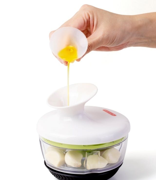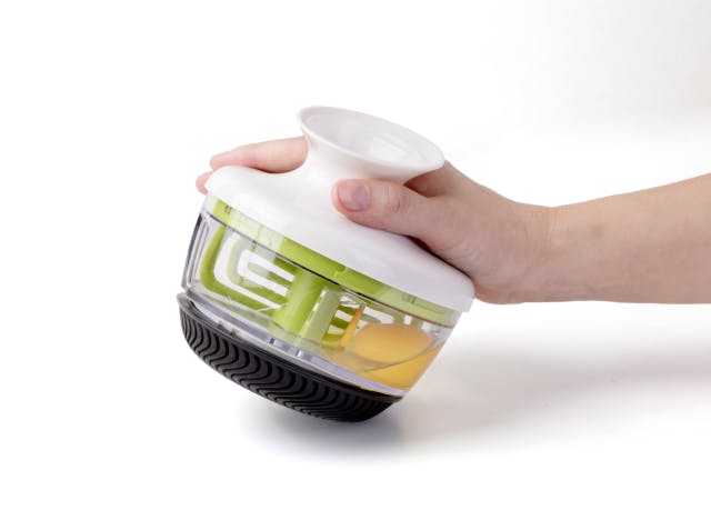 従来のチョッパーにありがちな手や紐で回すタイプと異なり、腕の力で強くカッターが回せる上、食材を目視しながら混ぜ合わすことができる斬新なアイデアが、審査員に高く評価されています。