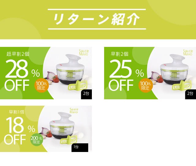 2022/05/13 16:09※ご使用前に必ずご確認下さいこの度は当プロジェクトにご支援いただき誠にありがとうございました。商品は無事に到着しましたでしょうか?到着後に、蓋が開かない、開きにくい、底蓋が回らない等のご質問が数件ございました。まだ開封されていらっしゃらない方もおられると思いますので、今一度、ご使用前に商品同梱の「かんたん操作ガイド」及び「取扱説明書」をご確認下さい。特に以下内容については必ずご確認をお願いいたします。※蓋のロック箇所をご確認ください蓋にはロック箇所が2カ所あります。「unlock」の位置に持っていかないと開かない設計になっています。特に、写真右側の方のロックに少しでもかかっていると開きませんので、今一度ご使用前にご確認下さいませ。※カッターにガードが付いた状態(お届け時の状態)では転がせません(回りません)本体にセットされているカッターには安全上、ガードが付いております。ガードが付いた状態(お届け時の状態)では転がすことが出来ません。力任せに転がすと破損の原因になりますのでお気を付けください。ガードを外してから、本体にセットしていただき、蓋をロックしてから転がして下さい。上記をお試しいただいても尚、蓋が固くて開かない、カッターが回らない等の不具合がある場合は不良の可能性がございますので、大変お手数ですがその旨ご連絡の程よろしくお願いいたします。当商品は操作に慣れるまで少しお時間がかかる場合がございますが、慣れるといろいろとお作りいただけ、楽しくご使用いただける商品かと思いますので、是非ご活用いただけましたら幸いです。今後ともSauce Mavoをどうぞよろしくお願い申し上げます。 もっと見る商品お届けについて【Sauce Mavo】
