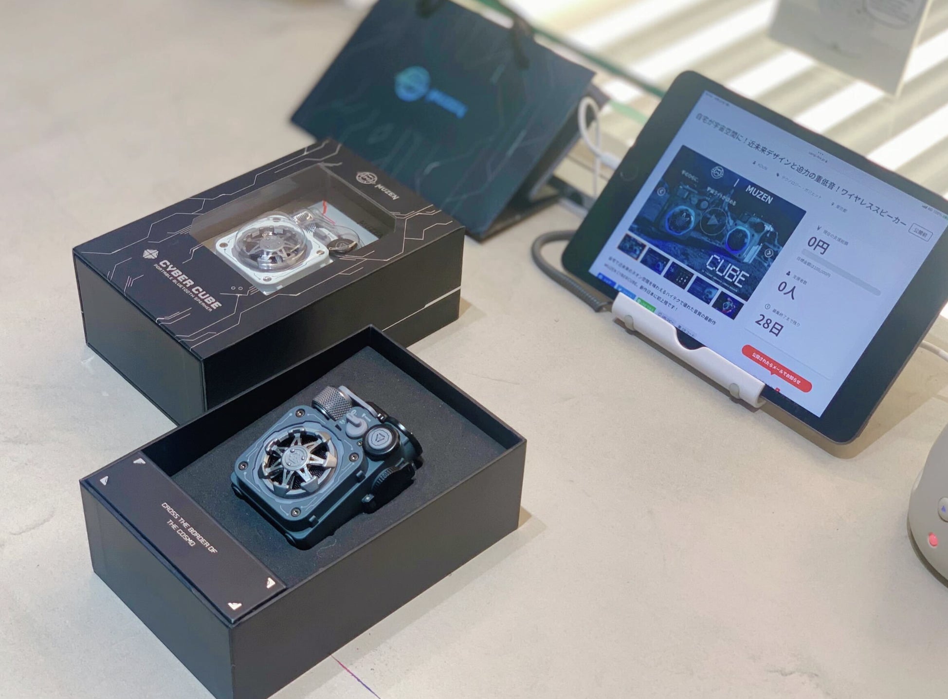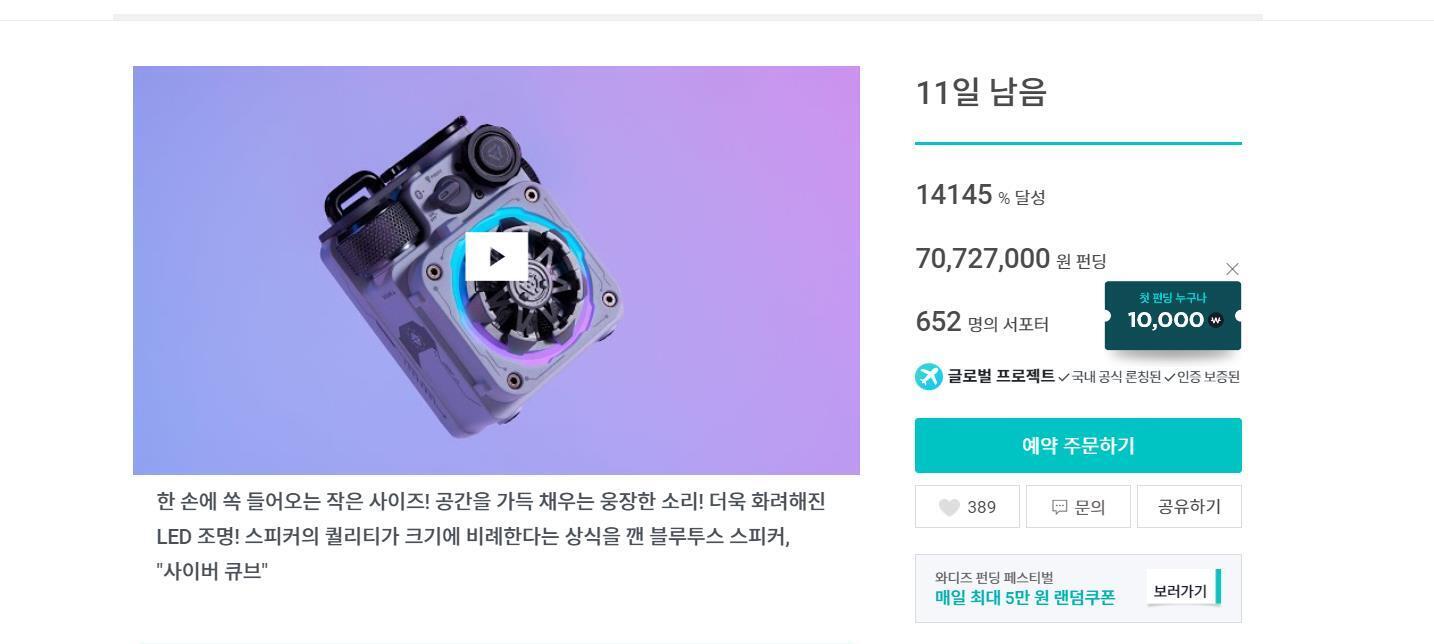 リンク:[1억펀딩] 작은 몸집에 강력한 사운드, 뮤젠 사이버큐브 블루투스 스피커 | 와디즈 펀딩 (wadiz.kr)