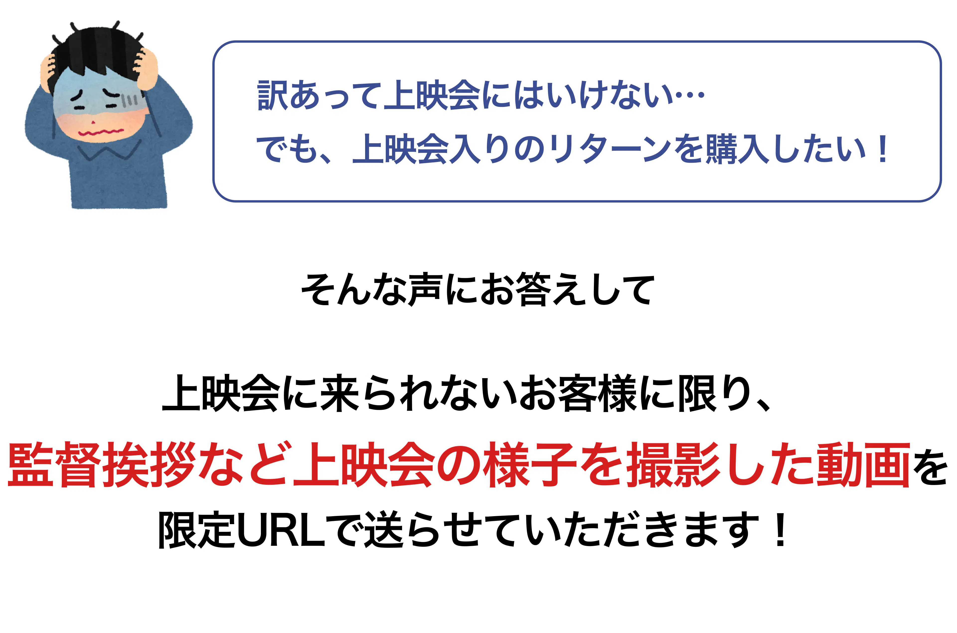 →公開前に本編映画を御覧いただける限定URLをメールアドレス宛に提供いたします。
