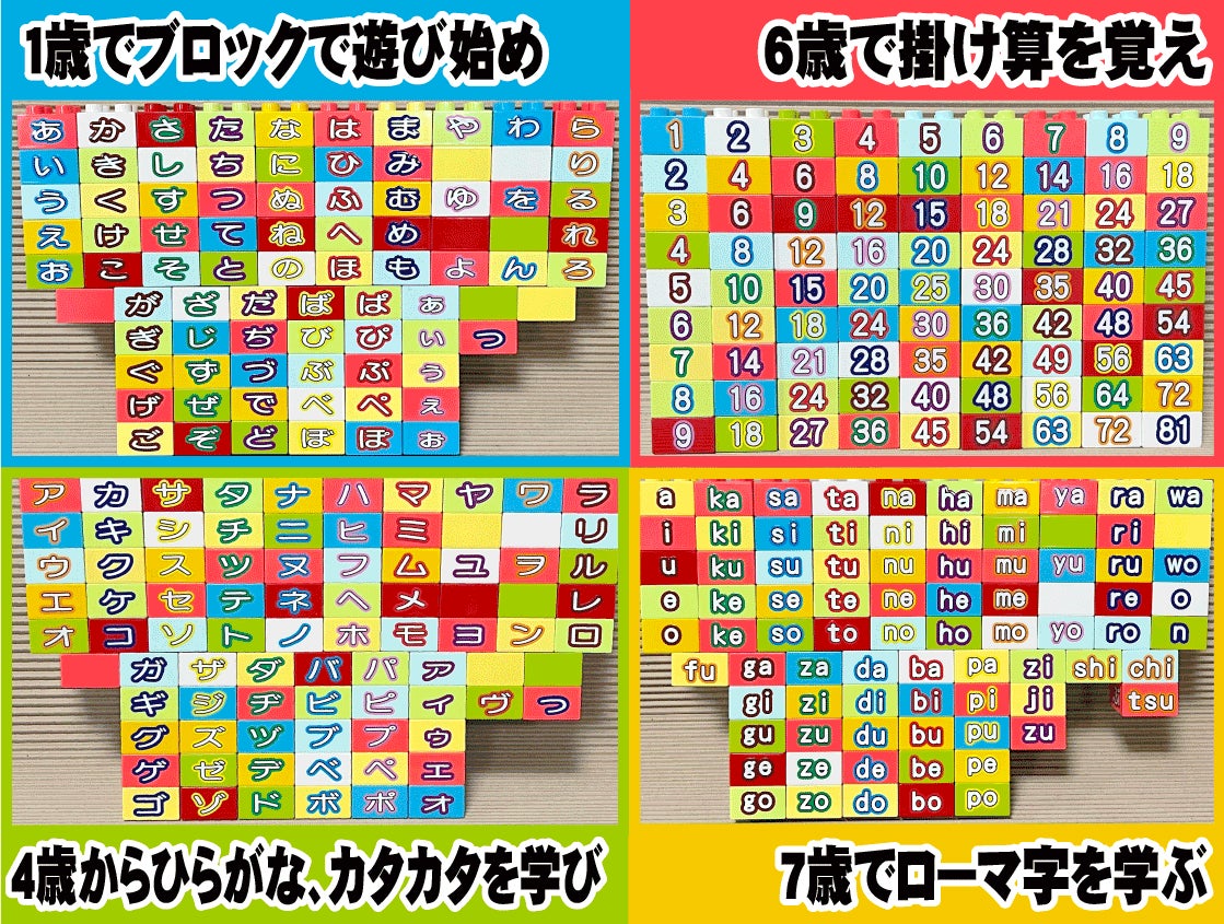 何を贈っていいか?難しいプレゼント。 ひらがな、カタカナ、ローマ字、掛け算ブロックはとっても喜ばれる知育玩具です。