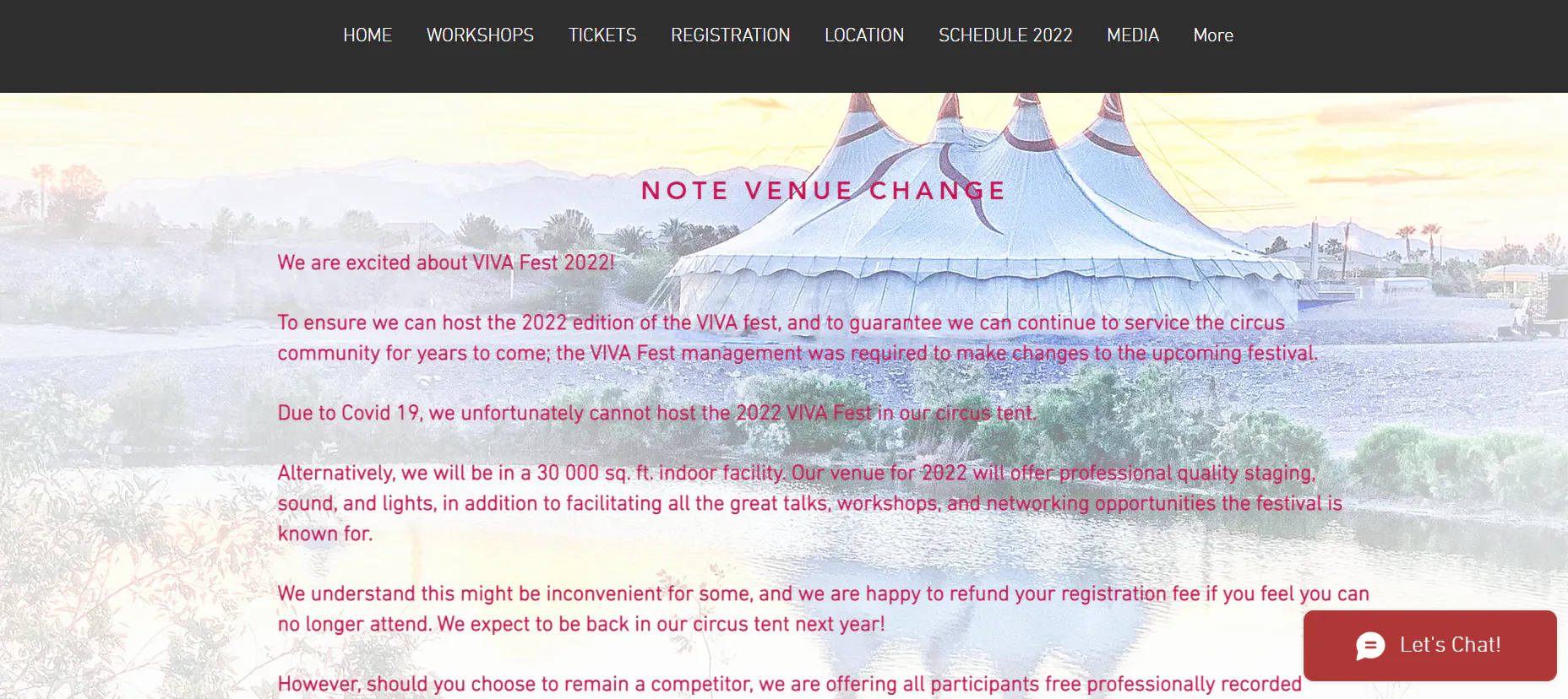 こちらは、大会事務局のHPより確認が取れております。大会事務局HPのトップ画面、冒頭2行目より、”To ensure we can host the 2022 edition of the VIVA fest, and to guarantee we can continue to service the circus community for years to come ”とあります。"ensure"とは、確認するという意味の英単語であります。また”to guarantee we can continue to service the circus community for years to come”、来たる年に向けてサーカスコミュニティのサービスを提供し続けられることを保証する、と書かれております。