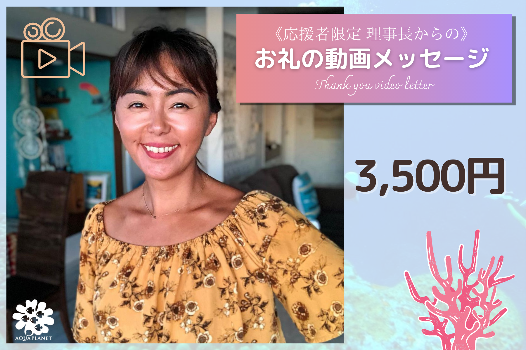 田中律子より、このプロジェクトへの応援者の皆様へ向けた、感謝のビデオレターを撮影し、お送りします。支援金は、サンゴの植付け活動に役立てられ、皆様の思いを北谷移植事業や石垣養殖畑に活用させていただきます。