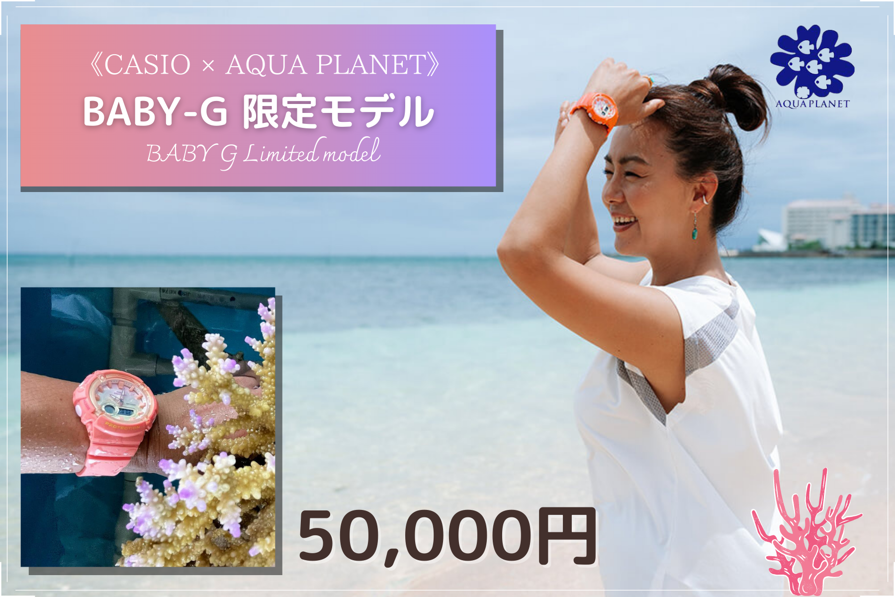 第4弾目となるBABY-Gとアクアプラネットの最新コラボモデル(2021年度版)をお送りします。沖縄の海とサンゴをモチーフにデザインした、限定モデルです。パッケージには、田中律子がサインを記載させて頂きます。10気圧以上の防水機能を搭載しているのでスキューバダイビングにもぴったり。アクアプラネットのサンゴ移植活動でも使用しています。
