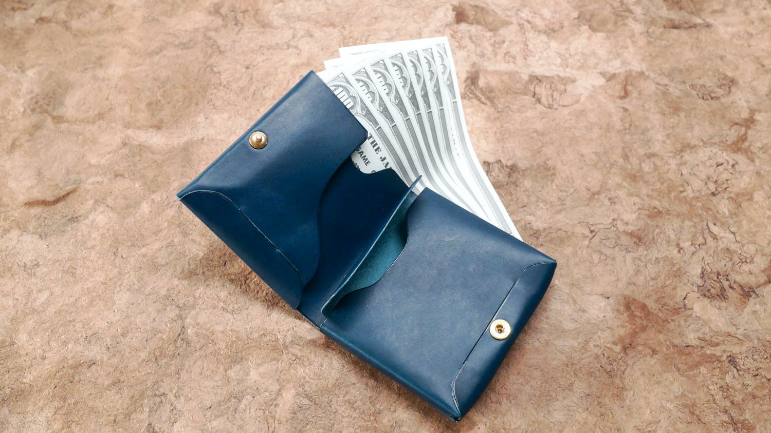 しっかりとお札が隠れた状態で15枚まで収納できる、収納力抜群なお札入れ。お札を取り出しやすいように切り欠けも用意しています。