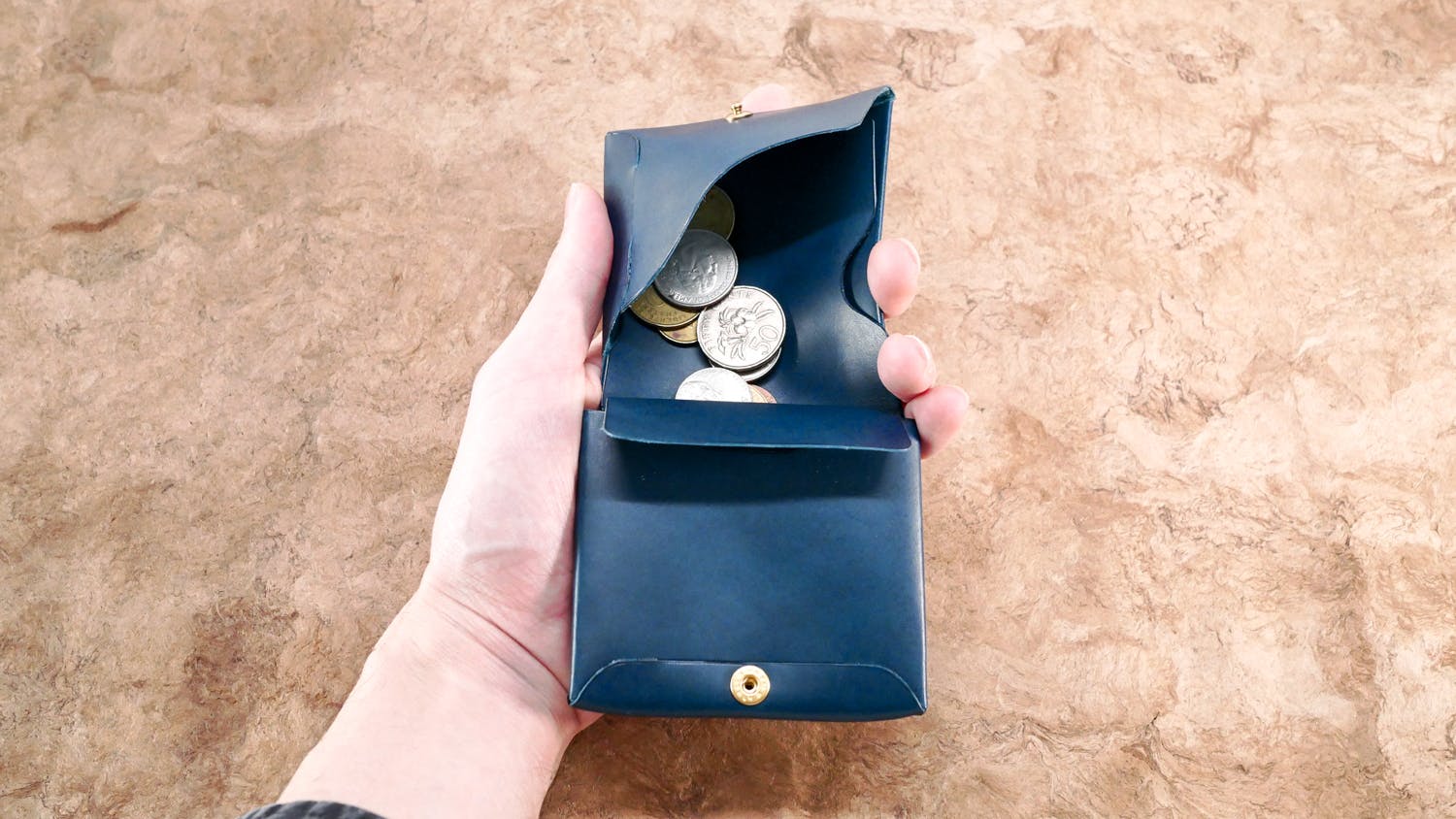 革が馴染むまでは、しっかりと両サイドを潰して「Uの字」型に形をくぼませてから小銭を滑らせてください。