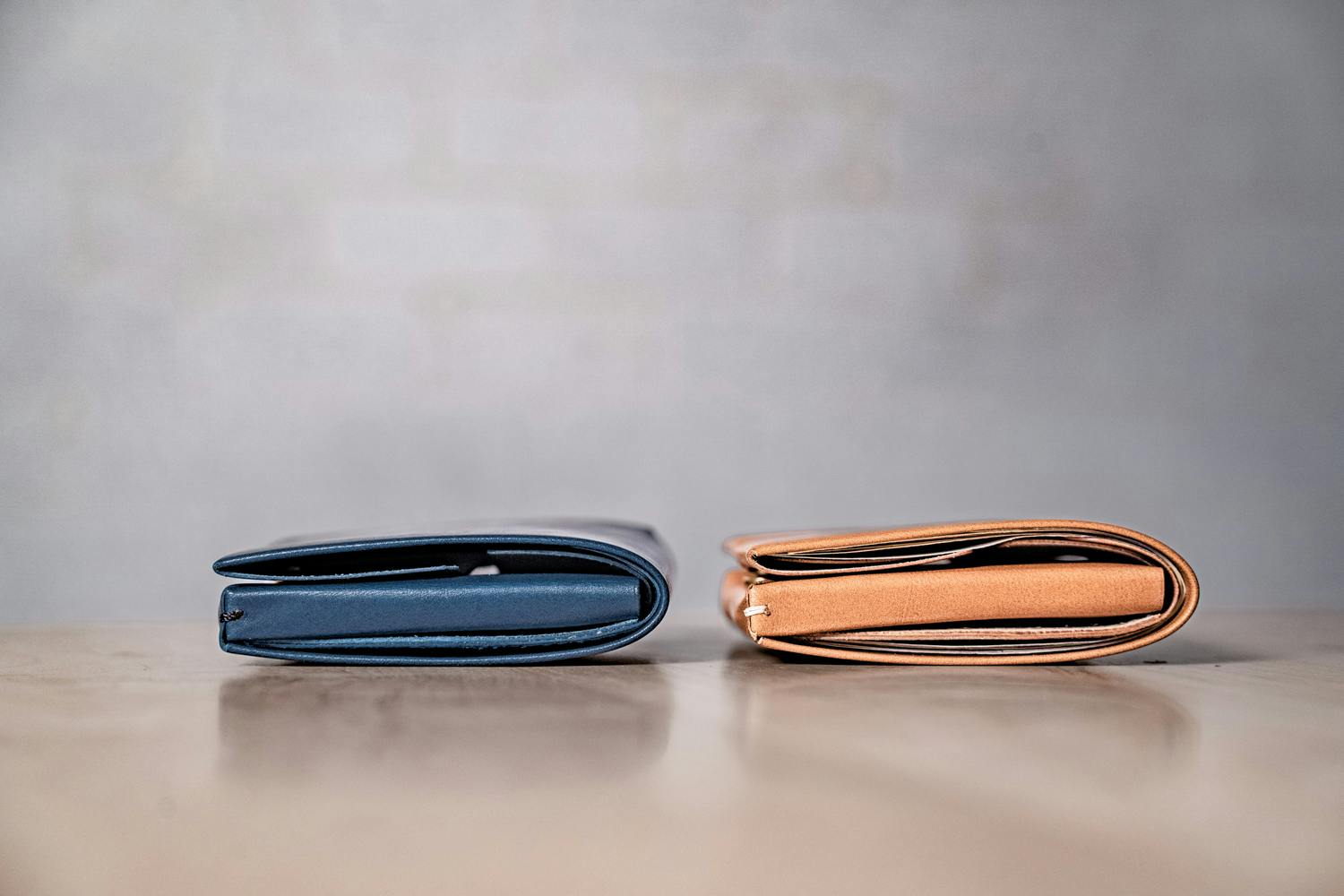 硬く、マットな風合いの革ですが、表層のキメが細かく、経年した後はまるで別の種類の革かのようにツヤ感が出てきます。控えめなオイル感にも関わらず裏面のキメが細かいところからも繊維の密度の高さがわかります。