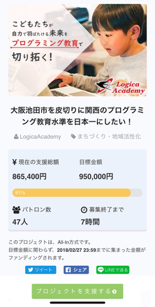 2018/02/27 17:18皆様,こんばんは! 終了まで残り7時間となりましたが沢山のご支援を頂きまして,ついに90%の大台を超えることができました☆ 私たちの子供たちが大人になる頃に,経済的に安定した生活を送れるどうかは,今現在どれだけ満足なIT教育を受けられるかにかなりの程度依存しています。 子供たちの明るい未来のために,どうか皆さんのお力をもう少しお貸しください! 一緒に子供たちが安心して暮らせる未来を創り上げて参りましょう(๑•̀ㅂ•́)و✧ もっと見る