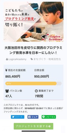 2018/02/27 23:16こんばんは,ロジカ・アカデミーです! 今秋からNHK朝ドラの舞台となるインスタントラーメン発祥の地「池田市」を中心に,プログラミング教育者を育てるためのクラウドファンディングを実施しております。 池田市はソフトバンクのCSR事業の一環でPepperくんが100台貸与されており,各小中学校に6台ずつPepperくんがいるのですが,なかなか有効活用されていないという残念な状況にあります( ;∀;)この状況を何とかしていきたいと思って立ち上がった今回のプロジェクト! まさかここまで来れるとは思いませんでしたが,20名以上のスタッフが多くの犠牲を払って頑張ってくれたおかげでなんと95%まで来ることができました(`・ω・´) 目標達成まで後ほんのもう少し...もう少しなんです! ぜひあなたの一押しで子供たちの未来を切り開いてください(๑•̀ㅂ•́)و✧ もっと見る