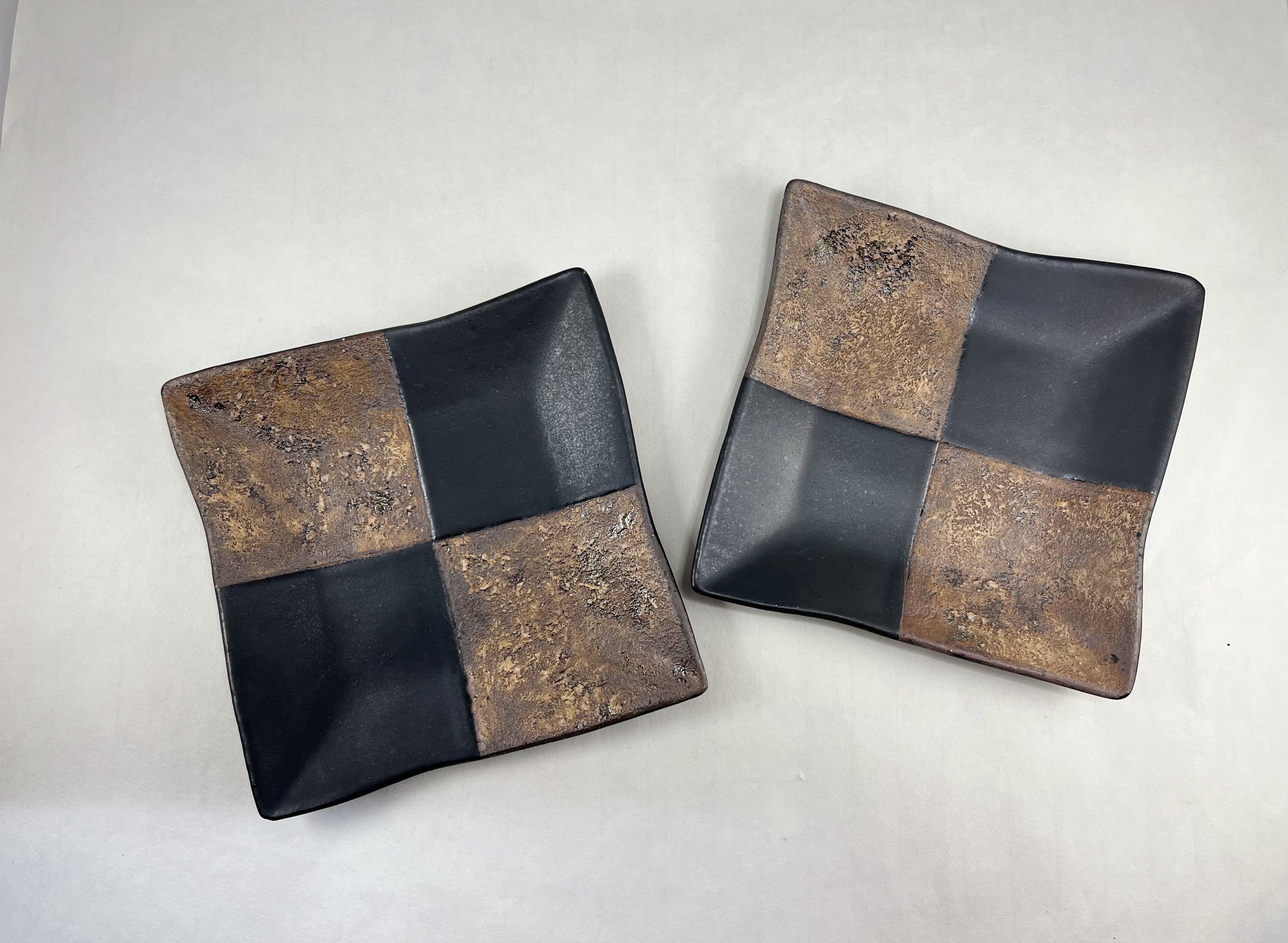 日々の生活に彩りを添える器を制作している「陶房 煌知」の、黒マット釉と錆釉を市松模様に掛け分けたお皿です。錆釉の部分に細かな凹凸があり、渋く重厚な感じの仕上がり。